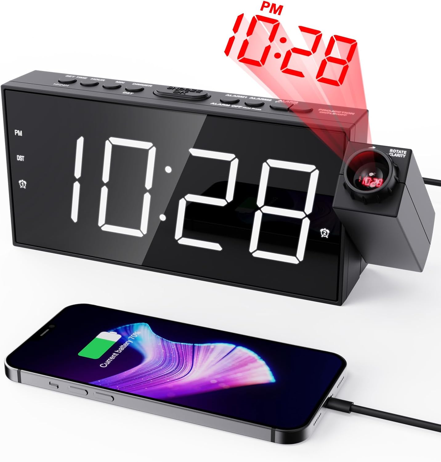 ROCAM Wecker mit Projektion für Schlafzimmer, LED Projektionswecker an der Decke mit USB Ladegerät,
