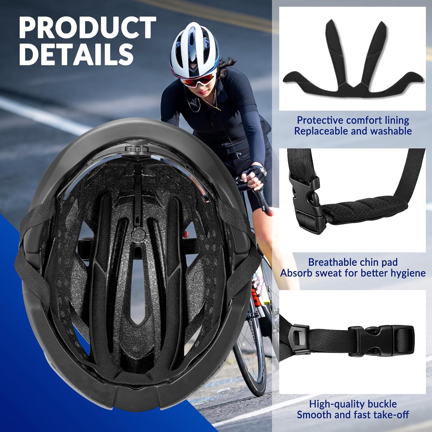 - 【HOCHWERTIGE DETAILS】Mit Kopfumfang-Einstellknopf auf Radhelm können Sie die richtige Grösse für Ihren Kopf einstellen. Verdicktes Kinnpolster mit vielen atmungsaktiven Löchern hilft bei der Schweissaufnahme, ist abnehmbar und waschbar.