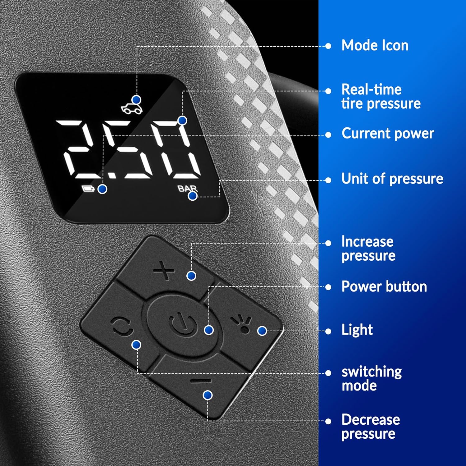 - 【5 Modi & 2 Luftdruckeinheiten】Die Mini Pumpe mit 5 Modi steht Ihnen zur Verfügung: Aufpumpen für Auto, Aufpumpen für Motorrad, Aufpumpen für Fahrrad, Aufpumpen für Ball, Benutzerdefinierte Modi. Durch die 5 Modi können Sie Bereich des