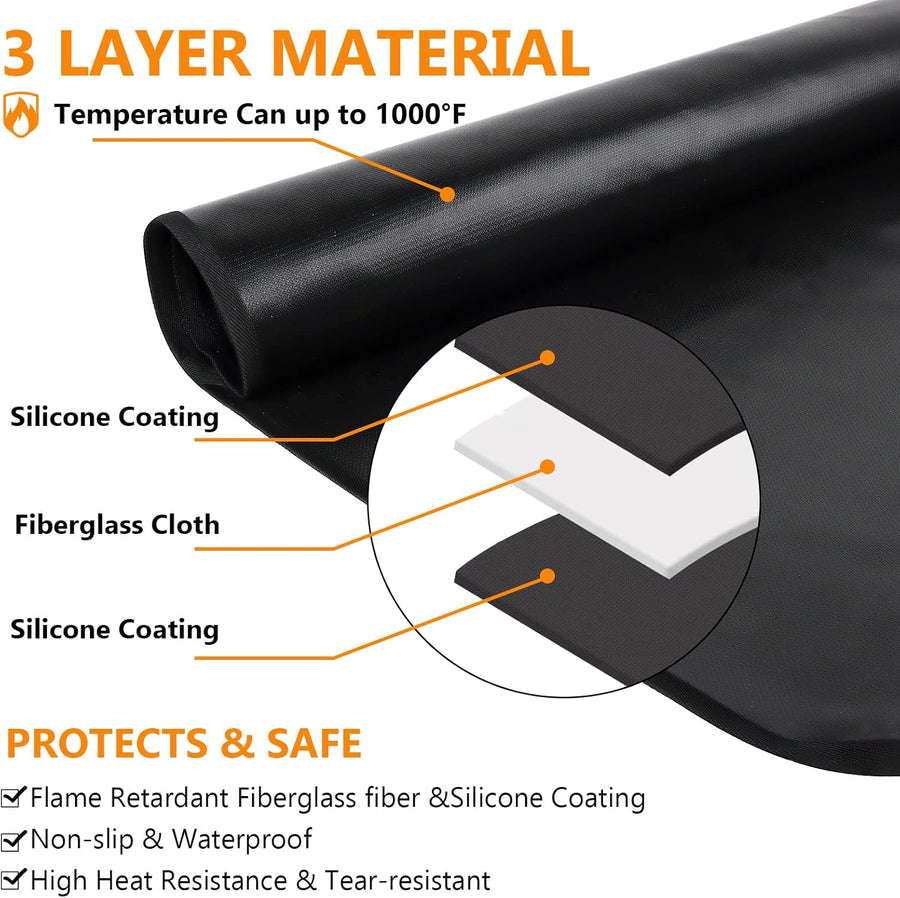 - đ„ăLanglebiges Glasfasermaterială Die Feuermatte besteht aus zwei Schichten wasser- und ölabweisendem Silikon und einer Schicht feuerfester Faser, die eine HitzebestĂ€ndigkeit von bis zu 1000 Grad Fahrenheit bieten kann. Die Feuermatte ist nicht