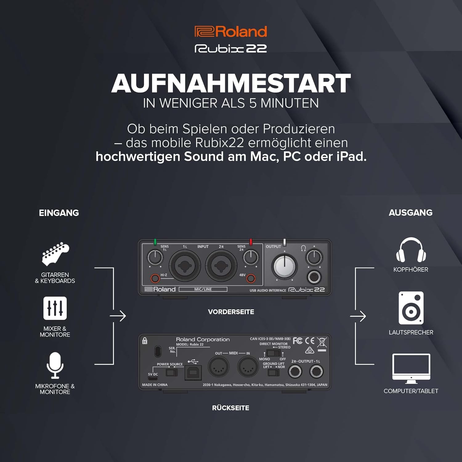 - USB-Audio-Interface mit je zwei Ein-/Ausgängen