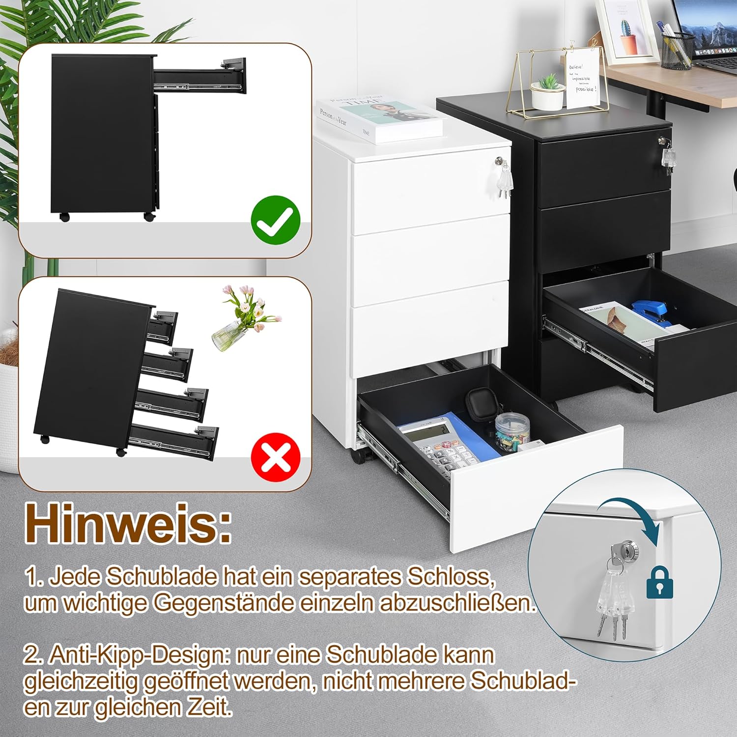 - [Sicher und abschliessbar]: Die oberste Schublade ist mit einem Schloss versehen, das alle Schubladen des Aktenschranks verriegelt. So können Sie Ihre wichtigen Dokumente schützen. Wir liefern Ihnen 4 Schlüssel als Backup
