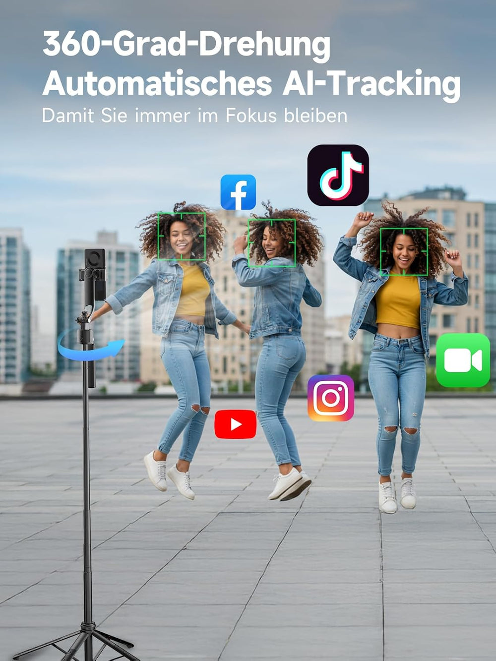 - [Keine App erforderlich, einfach zu bedienen] Dieses intelligente automatisches selfie stick stativ ist für eine problemlose Verwendung konzipiert und erfordert keine App-Installation. Es ist mit allen iPhones und den meisten Android-Smartphones