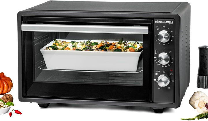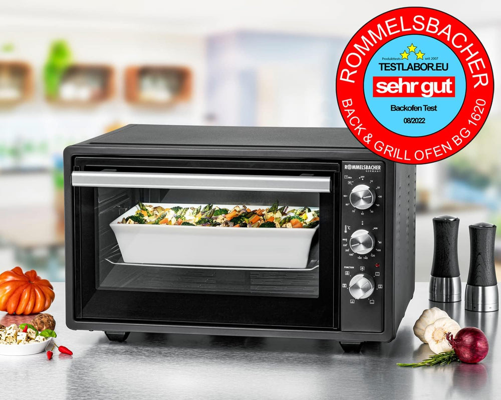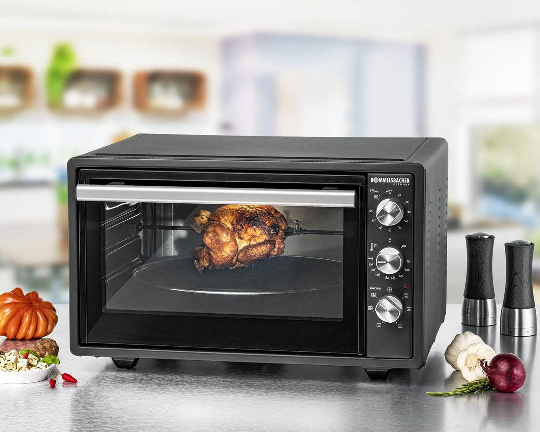 - grosser 37 Liter Backraum mit Spezialbeschichtung, für Backformen bis 36 cm Ø, Nutzmasse ca. 39,5 x 38 x 20 cm (BxTxH), 3 Einschubebenen, Backraumbeleuchtung, 3 spezielle Edelstahl Heizelemente, kurze Vorheizzeit, mit motorischem Drehspiess für Hähnchen/Spiessbraten