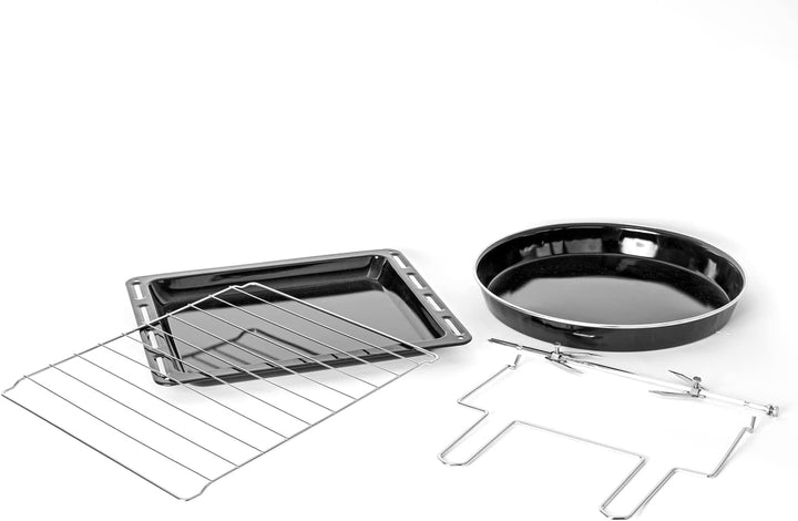 - Inklusive: emailliertes Brat-/Backblech rund, emailliertes Brat-/Backblech eckig, Grillrost, Drehspiessgarnitur