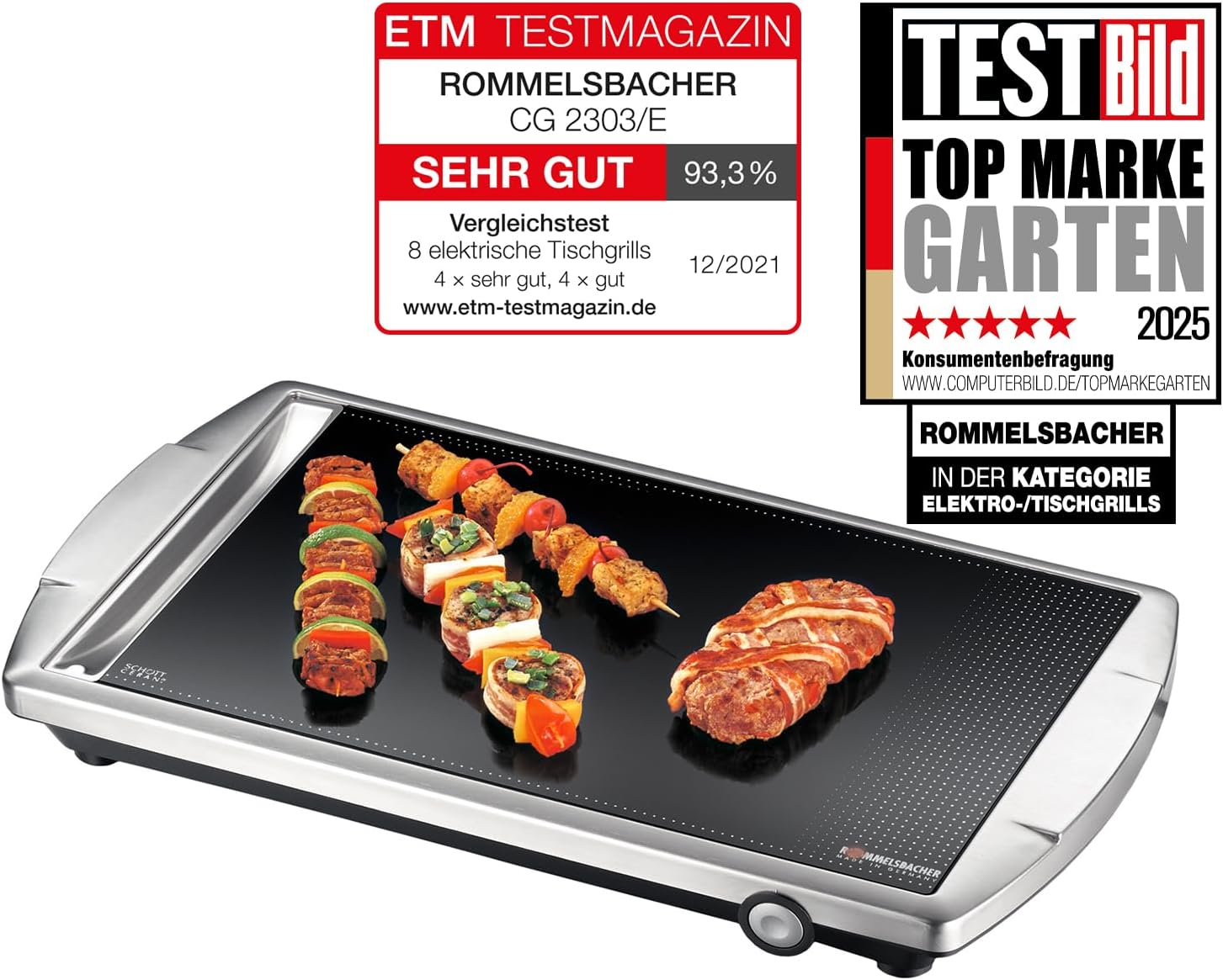 - Hochwertiges, pflegeleichtes Gehäuse aus gebürstetem Edelstahl, formschönes Softline Design, original SCHOTT CERAN Glaskeramik Grillfläche mit integrierter Warmhaltezone