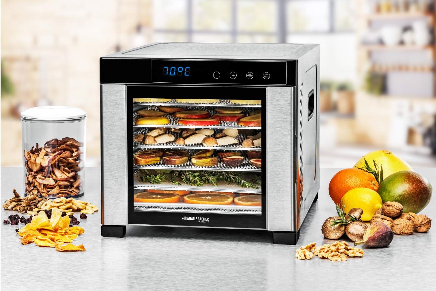 - mit 6 robusten Edelstahl Dörrtabletts (30 x 31,5 cm), grosse Dörrfläche 0,6 m², 1 Dörrgitter und 1 Dörrunterlage (BPA frei)