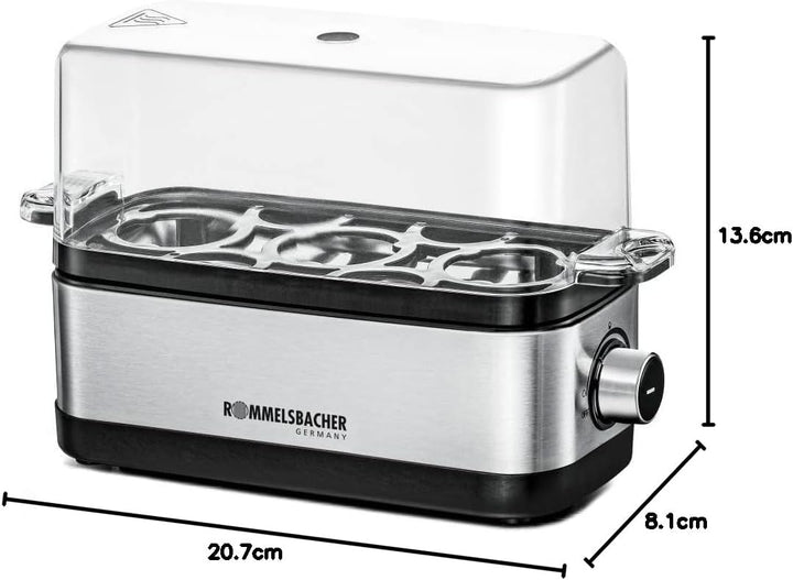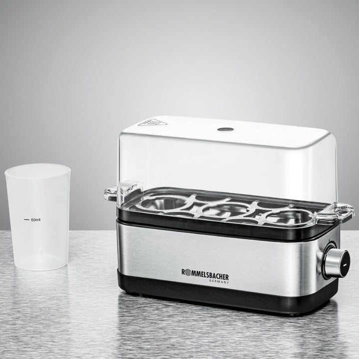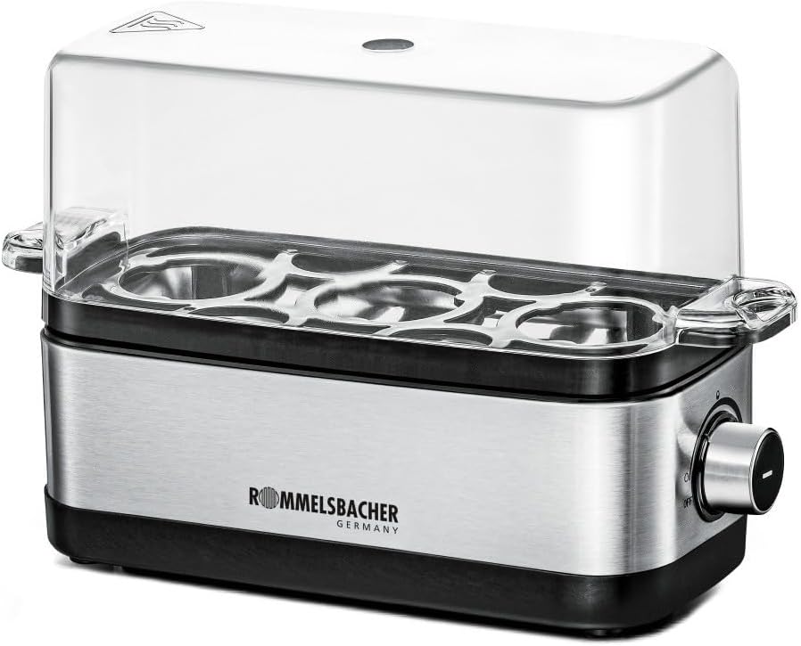 - pflegeleichte Heizschale aus Edelstahl, abnehmbarer Eierträger für 1 – 3 Eier