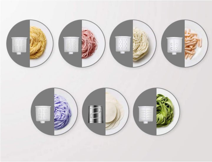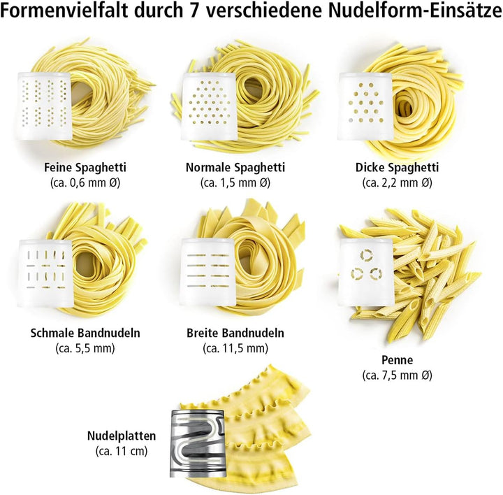 - 7 auswechselbare Nudelform-Einsätze, Aufbewahrung in integrierter Zubehörbox, Lüfter zum Vortrocknen der Nudeln bei Ausgabe (verhindert Zusammenkleben)