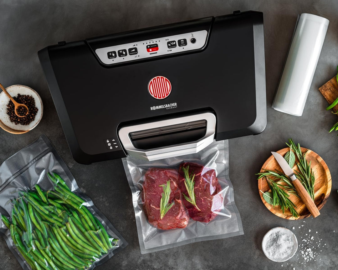 - Produkt 2: geeignet für Folien bis 30 cm Breite sowie für Vakuumierbehälter, mit integriertem Rollenfach inkl. Schneidemesser, Schlauchanschluss zum Vakuumieren in Behältern, beleuchtetes Sichtfenster, Statusanzeige für den Arbeitsfortschritt