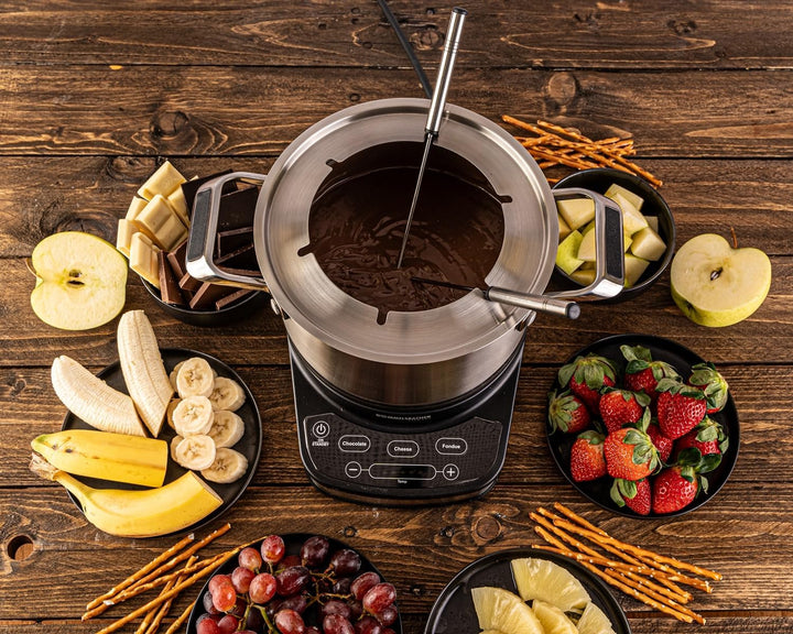 - Inklusive: 6 Edelstahl Fonduegabeln mit Kennung, Edelstahl Spritzschutzeinsatz mit Gabelfixierung