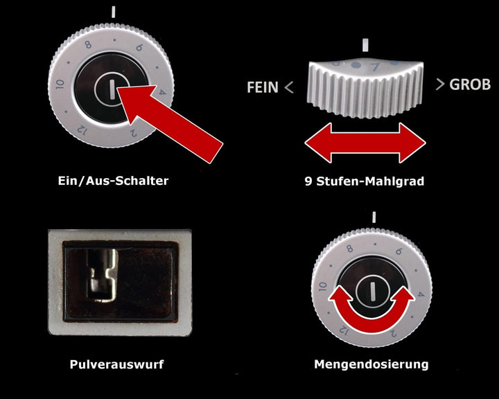 - Mahlgrad individuell einstellbar – von grob bis fein, Drehwähler für 2 – 12 Portionen