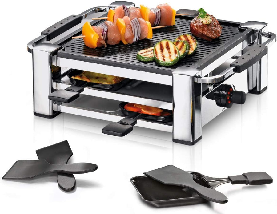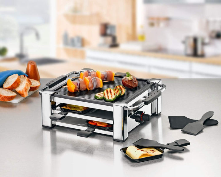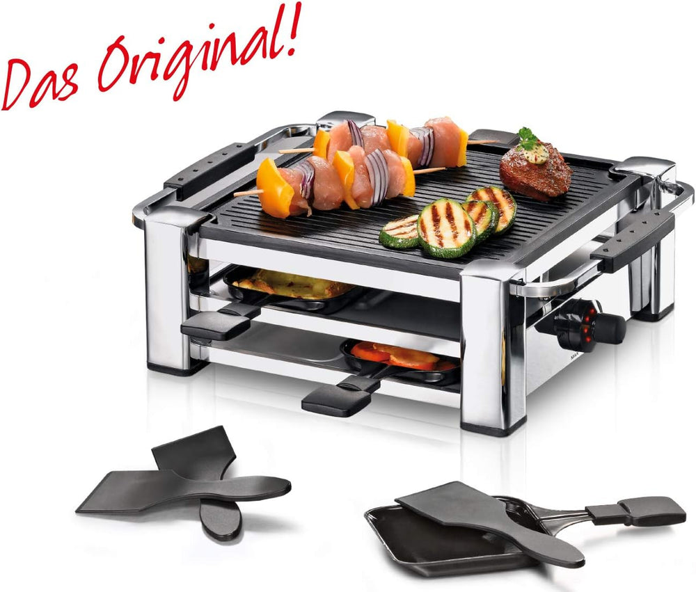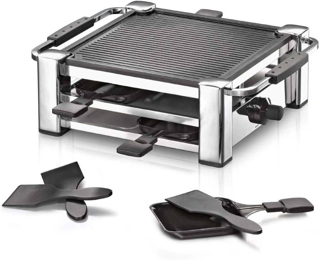 - elegantes, verchromtes Gehäuse in edlem Schweizer Design, massive, abnehmbare Alu-Druckguss-Grillplatte, 22,5 x 22,5 cm, gerippte Fläche für typisches Grillmuster
