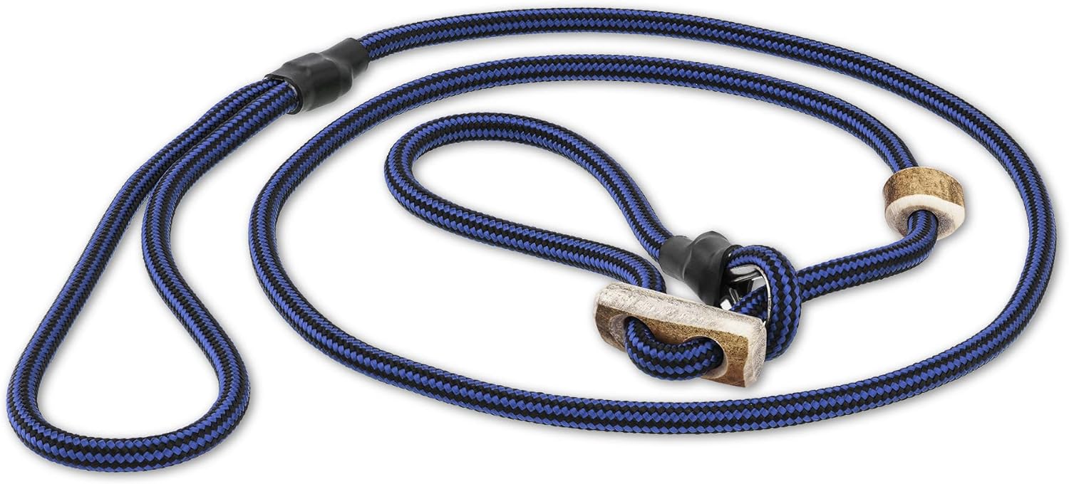 - Halsband und Leine: Bei diesem Leinen-Prinzip (Moxonleine, Agilityleine, Retrieverleine) ist direkt das Halsband integriert. Der Hund braucht kein weiteres Halsband zu tragen.