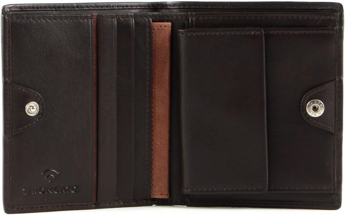 PRODUKTBESCHREIBUNGEN RONCATO Geldbörse - im schicken Design Daten Geldbörse: o Masse geschlossen: Breite ca. 9,5 cm, Höhe ca. 11 cm, Tiefe ca. 3 cm o Masse offen: Breite ca. 18,5 cm, Höhe ca. 11 cm, Tiefe ca. 2 cm o Gewicht: ca. 76 g o Farbe: Brown (Braun) o Material: Leder o Lieferumfang: RONCATO Geldbörse mit Etikett in RONCATO Geschenkbox, 1 x Sichtfach Ausstattung Geldbörse: o Geldbörse wird mit Druckknopf geschlossen o 3 Fächer für Kreditkarten, EC Karten, Visitenkarten etc. o 2 Seitenfächer für Personalausweis, Kalender, Bilder etc. o 1 abnehmbares Sichtfach o 2 Geldscheinfächer o 1 Fach für Münzgeld / Kleingeld o Das RONCATO Logo ist gut sichtbar eingearbeitet RONCATO Avana Wallet - Eine Geldbörse für den Alltag Diese neue RONCATO Avana Geldbörse ist ein richtiger Hit. Mit ihr erledigen Sie jegliche Angelegenheit Ihrer Finanzen mit Freude und Leichtigkeit. Die Geldbörse für Herren hat ein wirklich schickes Design, welches sehr schlicht ist und die Geldbörse klassisch wirken lässt. Zudem ist die Inneneinrichtung schlau designt worden und ermöglicht es Ihnen alles sortiert und organisiert zu verstauen. So haben Sie alles sofort griffbereit und haben keinen Stress beim Bezahlen an der Kasse. Überzeugen Sie sich selbst von dieser federleichten Geldbörse in geschickter Grösse!