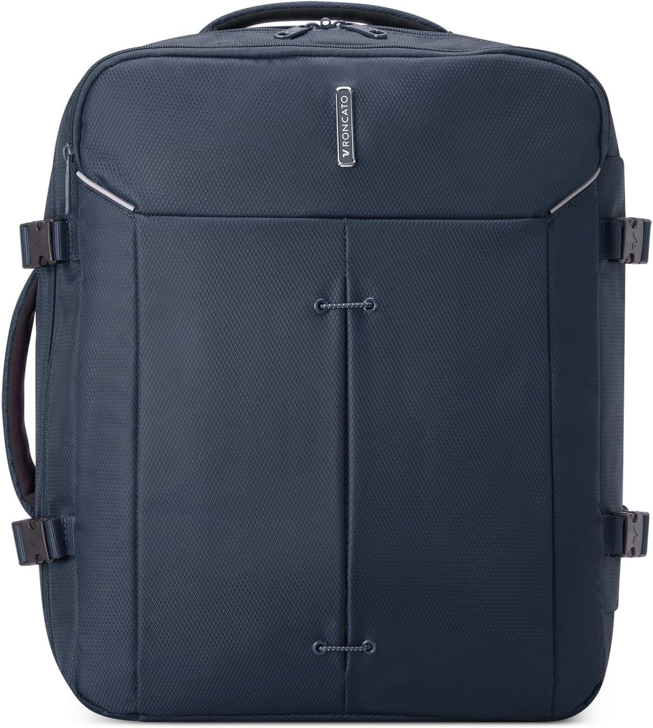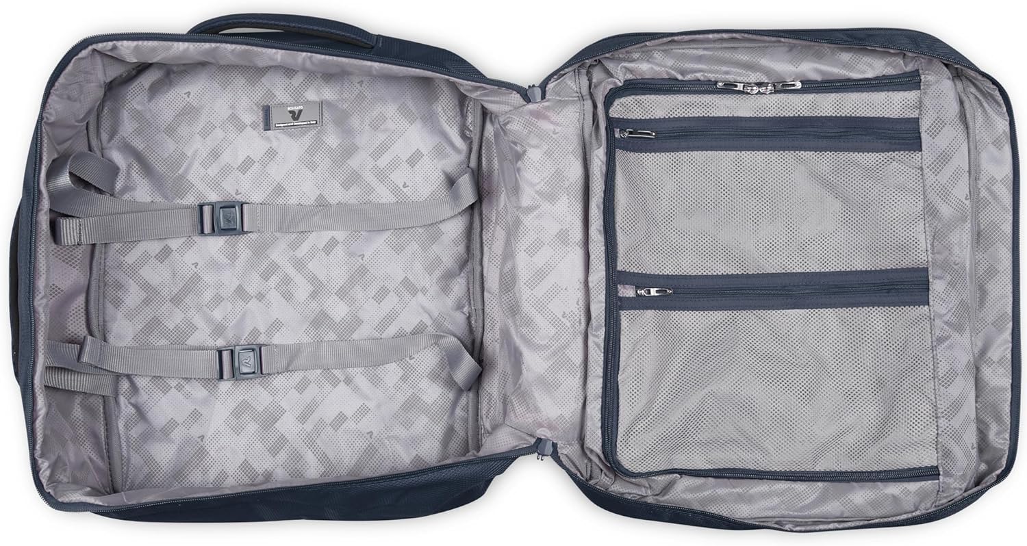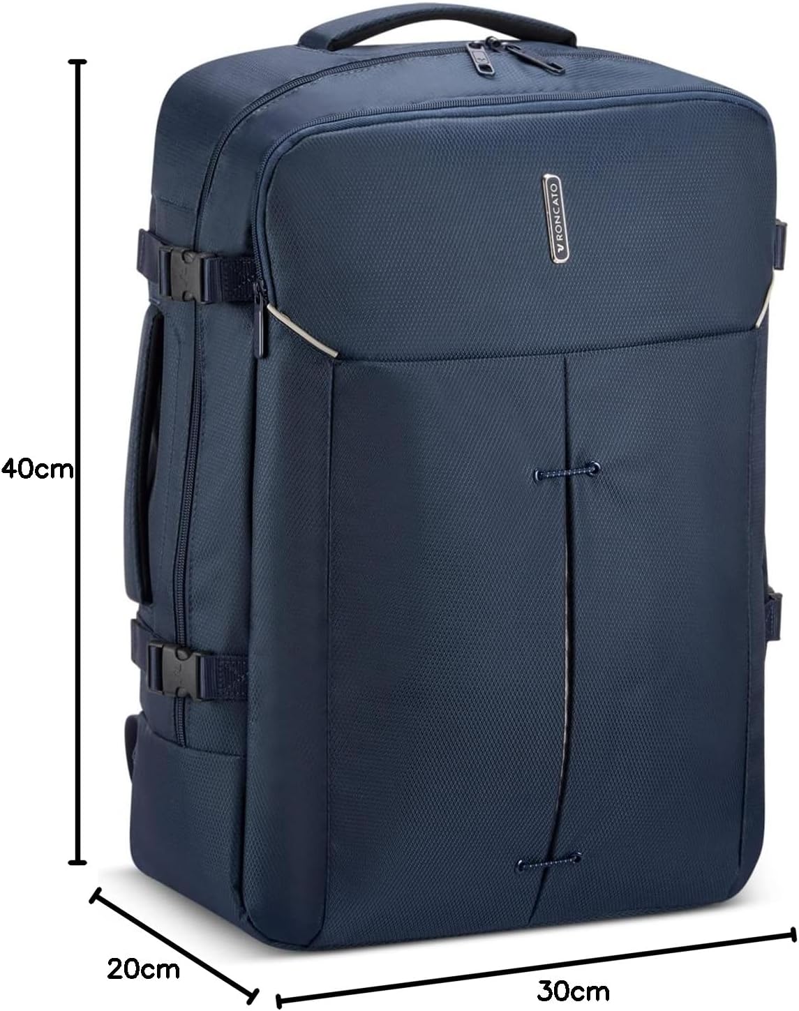PRODUKTBESCHREIBUNGEN RONCATO Rucksack leicht und widerstandsfähig Daten Rucksack: o Masse: Breite ca. 40 cm, Höhe ca. 52 cm, Tiefe ca. 17 cm o Gewicht: ca. 865 g o Volumen: ca. 42 l o Farbe: Dark Blue (dunkelblau / hellgrau) o Auf der Oberseite 1 Tragegriff gepolstert: ca. 16 cm o Auf der linken Seite 1 Tragegriff gepolstert: ca. 16 cm o 2 Schultergurte gepolstert, atmungsaktiv, stufenlos verstellbar: ca. 45 cm - 85 cm o Material: Aussen 100% Polyester, innen 100% Polyethylen o Nachhaltige Bestandteile innen: 100% recyceltes PET o Lieferumfang: RONCATO Rucksack mit Etikett Ausstattung Rucksack: o Rucksack wird mit abschliessbarem Two Way Zipper geschlossen o Im Hauptfach 1 Einschubfach, 1 Zipperfach und 2 Netz-Einschubfächer o Auf der Vorderseite 1 Zipperfach und 2 Gummischlaufen o Auf der rechten und linken Seite 2 Kompressionsriemen mit stufenlos verstellbarem Clipverschluss o Mit weiter Öffnung und verstärktem Boden ausgestattet o Ist gross genug für DIN A4 o Besitzt geräumiges Hauptfach o Ist als Handgepäck geeignet o Das RONCATO Logo ist gut sichtbar eingearbeitet RONCATO Ironik 2.0 Cabin Backpack 42 L - Ein Rucksack mit geräumigen Hauptfach In diesem RONCATO Rucksack kommen alle wichtigen Dinge für einen Flug oder Ausflug sicher unter. Im RONCATO Ironik 2.0 Cabin Backpack 42 L Rucksack kann alles übersichtlich verstaut werden und durch die weite Öffnung hat man einen guten Blick auf den Inhalt. Der Rucksack ist super leicht und zudem auch optisch ein echter Eye-Catcher.