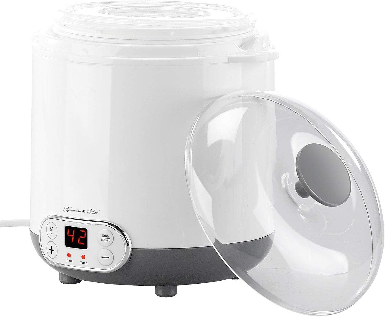 - Verfeinern Sie Ihren Joghurt nach Wunsch mit Fruchtsaft, Honig u.v.m. • Zeit und Temperatur individuell einstellbar: Timer 1 - 48 Stunden, Temperatur 20 - 55 °C • Einfache Bedienung über 4 Tasten • Stromversorgung: 230 Volt (Eurostecker)