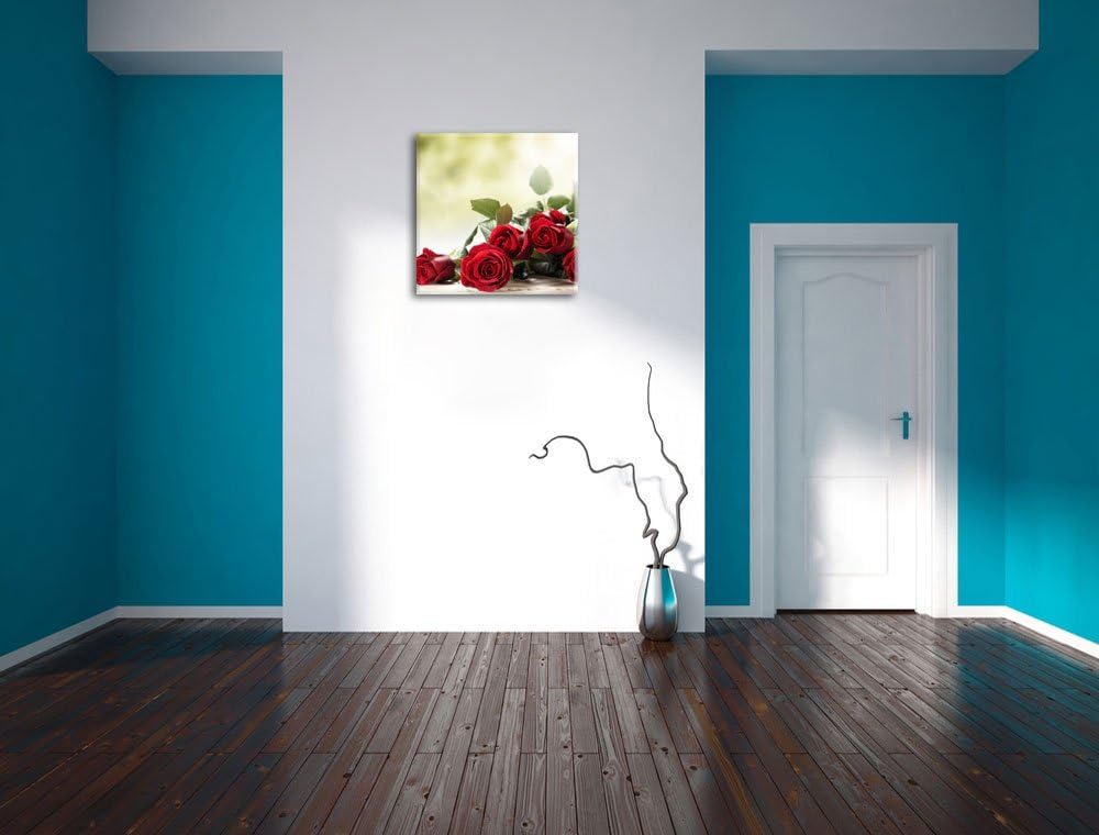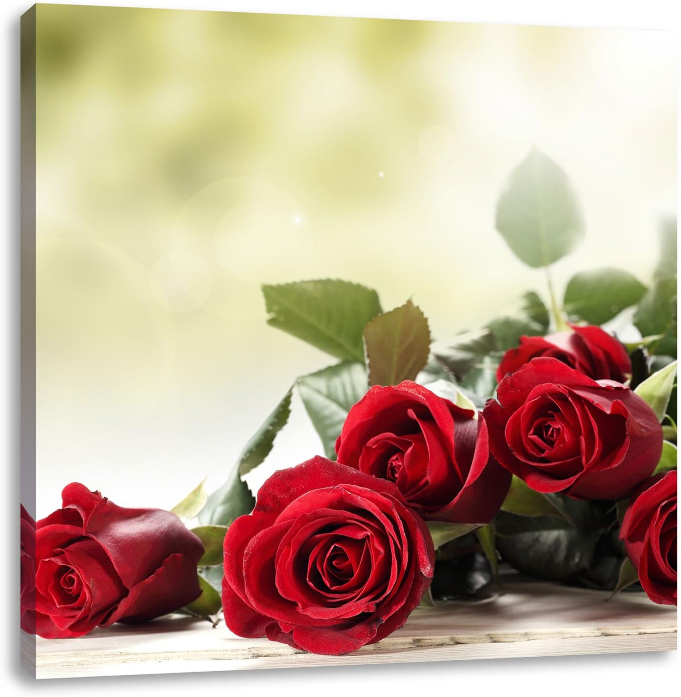 Rosenstrauss auf Holztisch, Format: 70x70 auf Leinwand, XXL riesige Bilder fertig gerahmt mit Keilra