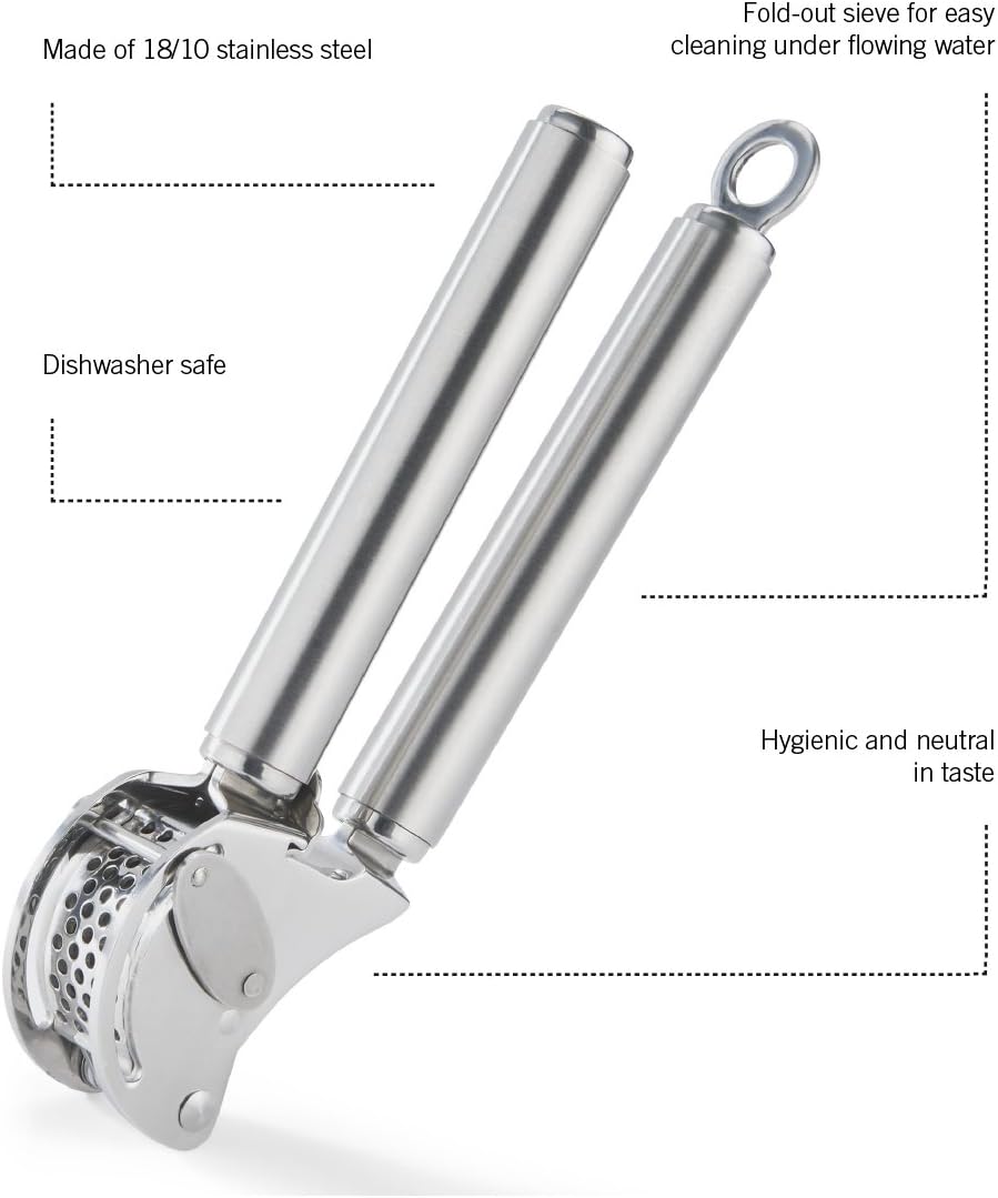 - Produkt 1: RÖSLE Knoblauchpresse mit Abstreifer aus rostfreiem Edelstahl zum schnellen und mühelosen Pressen von geschälten und ungeschälten Knoblauchzehen oder von frischem Ingwer