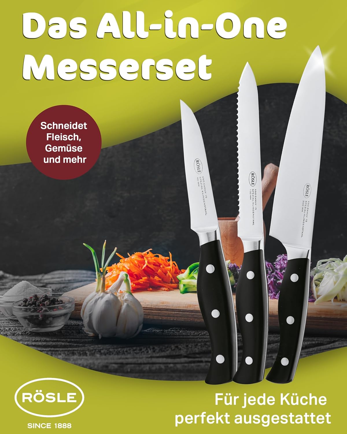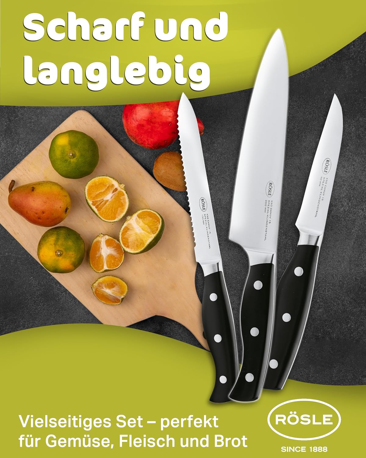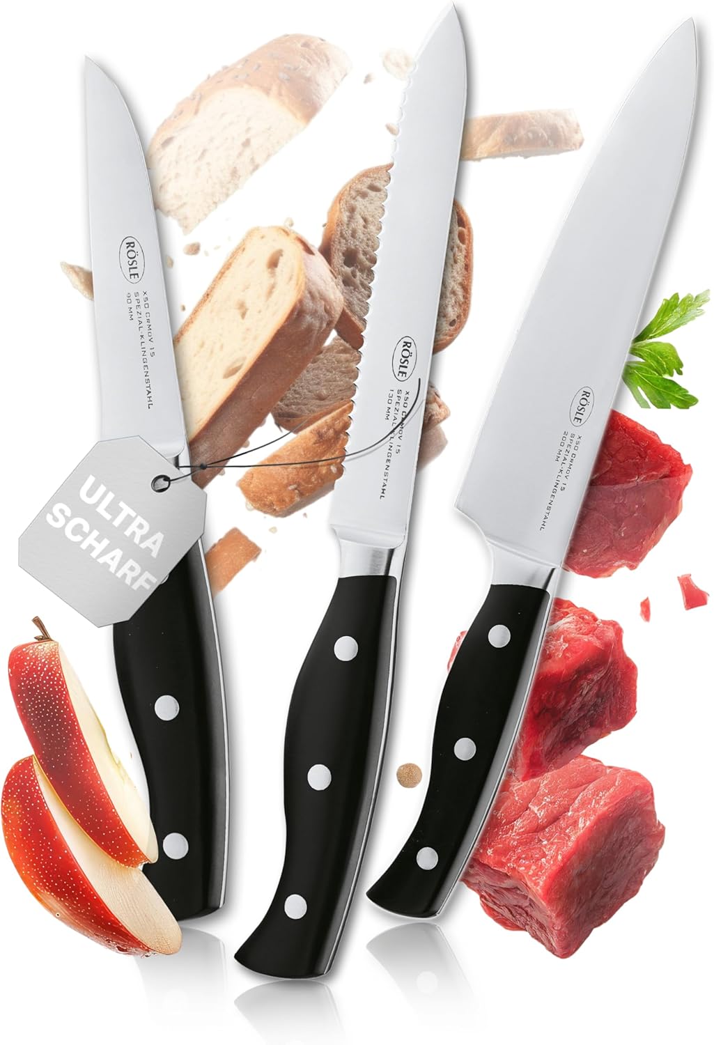 - RÖSLE PURA Messerset 3-tlg.: Hochwertiges Messerset mit Kochmesser, Universalmesser, Gemüsemesser - universelle Messer für die Küche