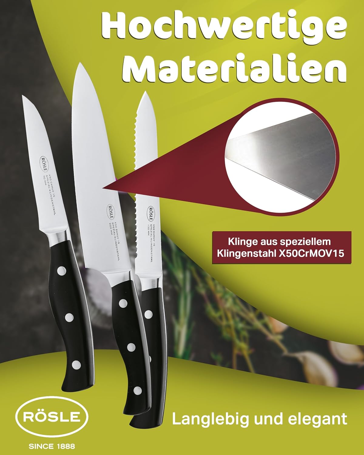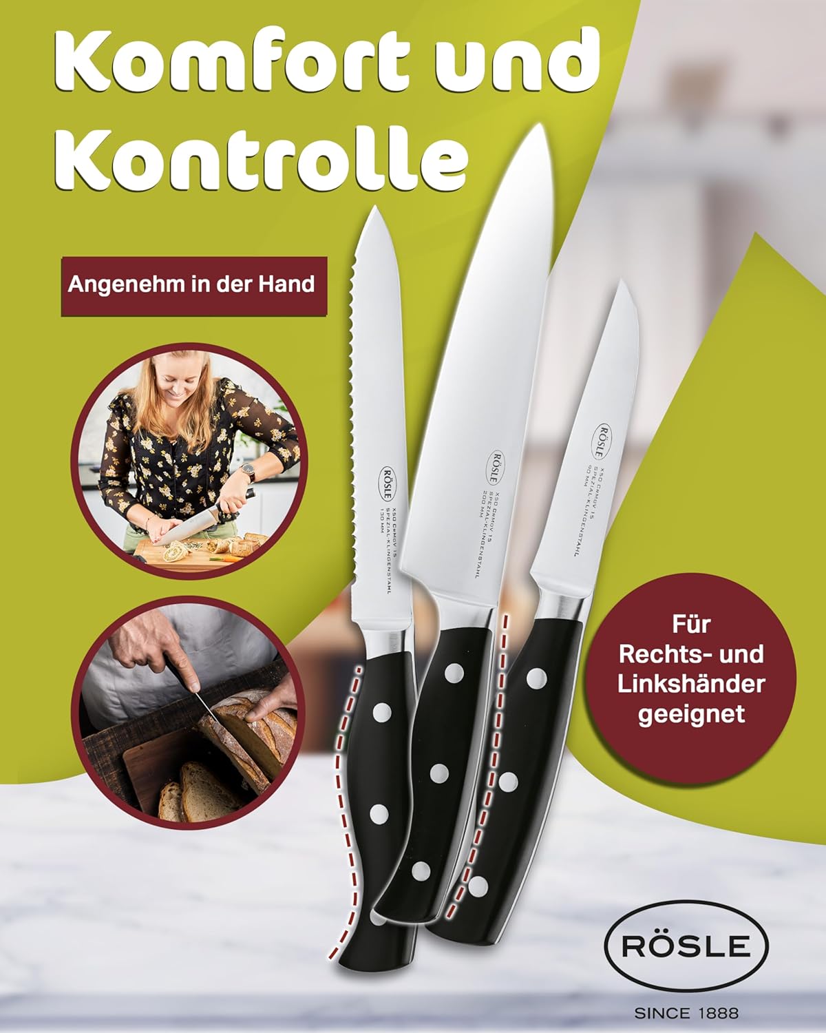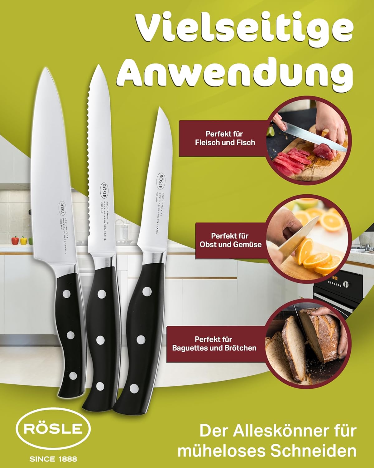 - RÖSLE PURA Messerset 3-tlg.: Hochwertiges Messerset mit Kochmesser, Universalmesser, Gemüsemesser - universelle Messer für die Küche