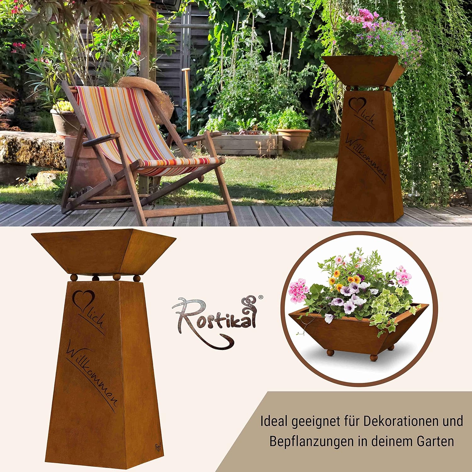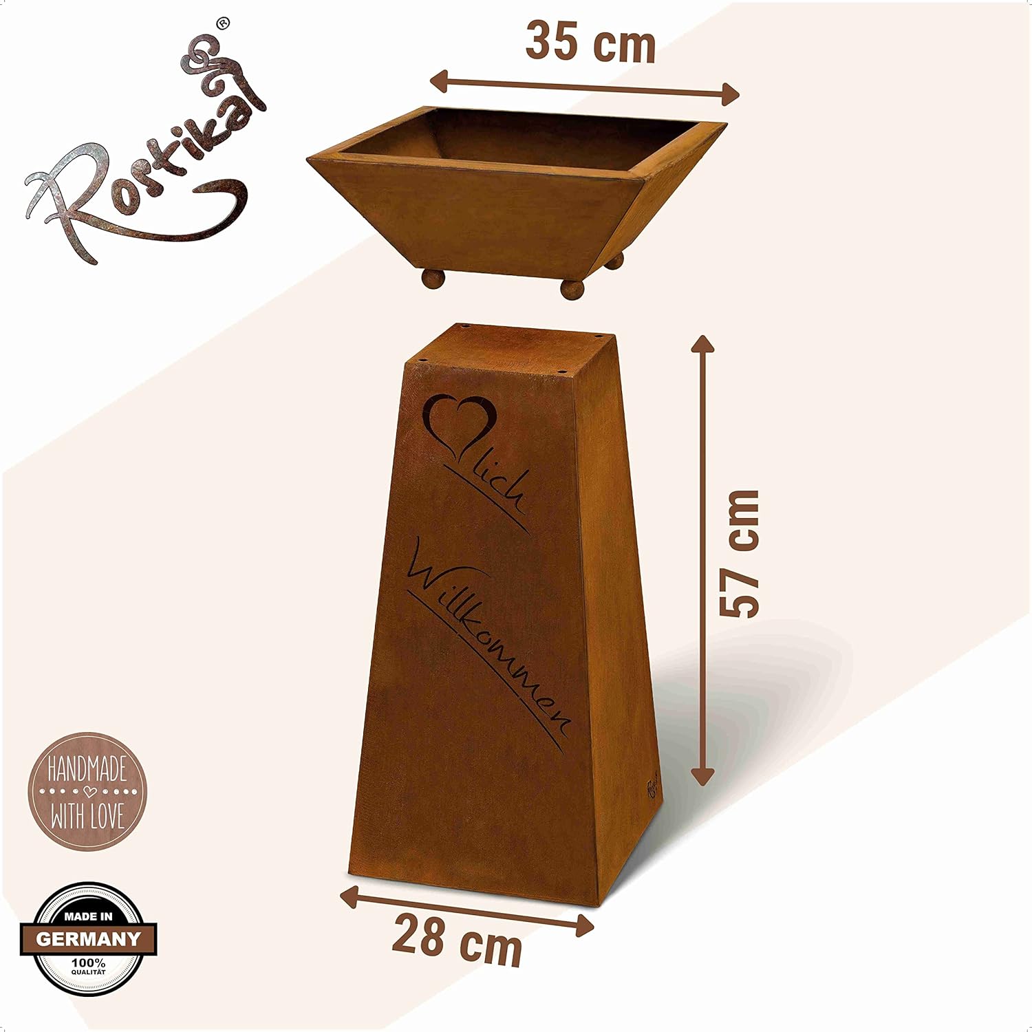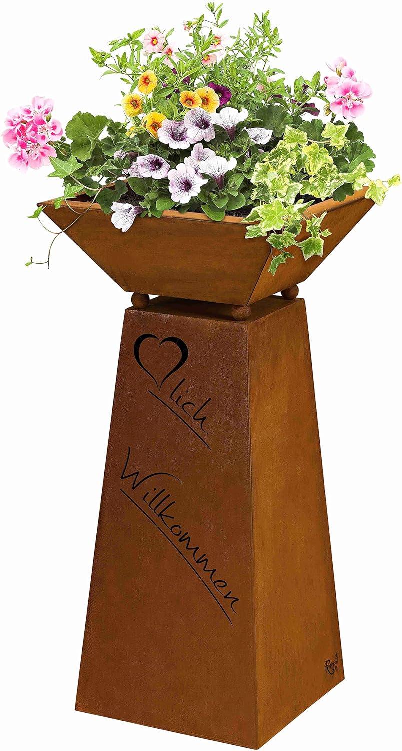 Rostikal | Willkommen Säule Garten Rost mit Dekoschale | Rost Gartendeko Pflanzschale | Höhe 72 cm B