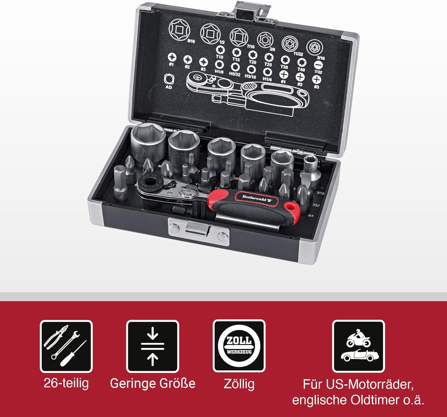 - Ideal für unterwegs: Dieser robuste Mini-Ratschensatz eignet sich aufgrund seiner geringen Grösse ideal als Bordwerkzeug für US-Motorräder - er kann im Tankrucksack oder unter der Sitzbank verstaut werden, um unterwegs stets für den Härtefall