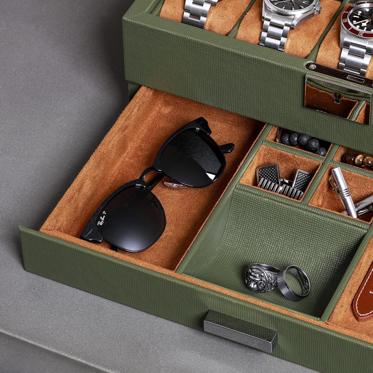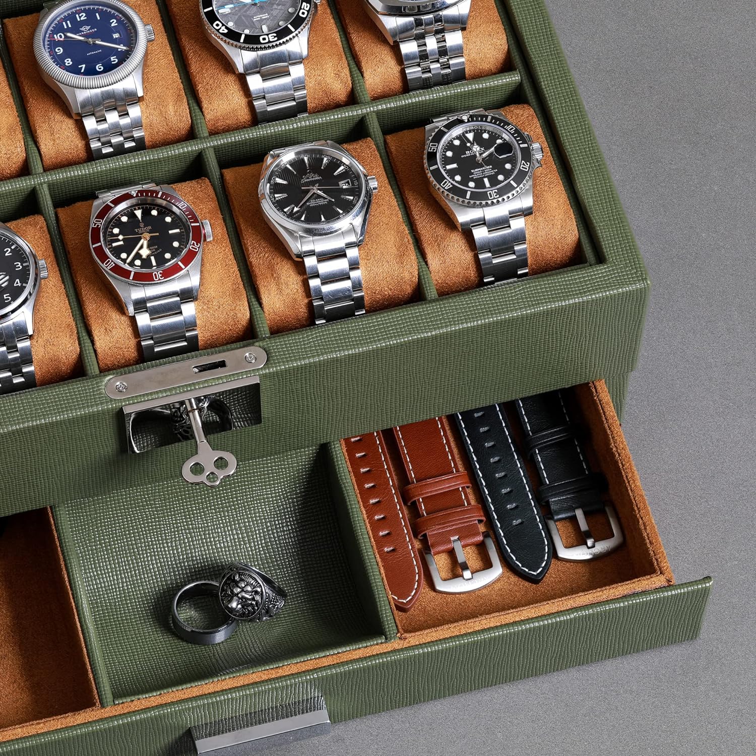 ROTHWELL Leder-Uhrenbox 10 Fächer mit Schublade, Luxus-Uhrenetui mit weichen Kissen, abschliessbarer