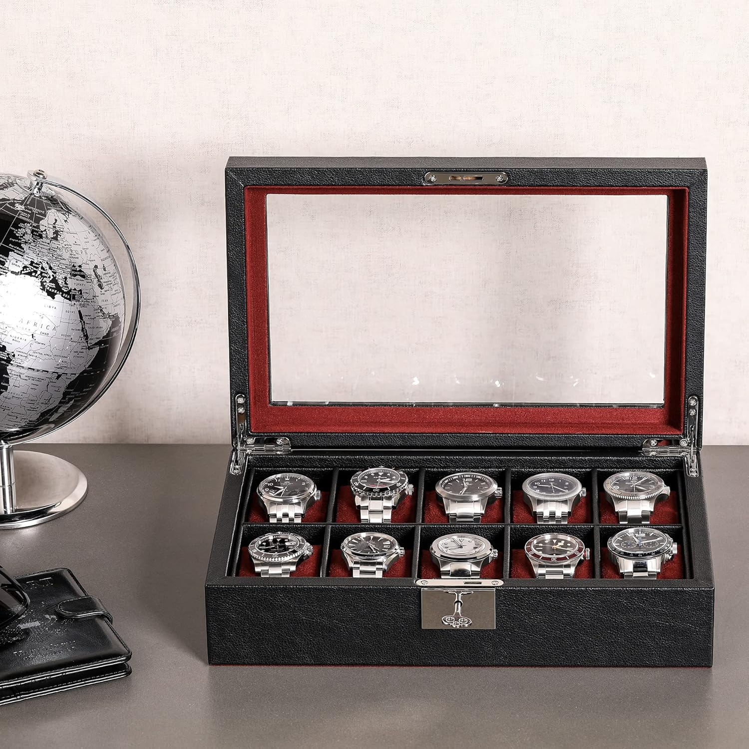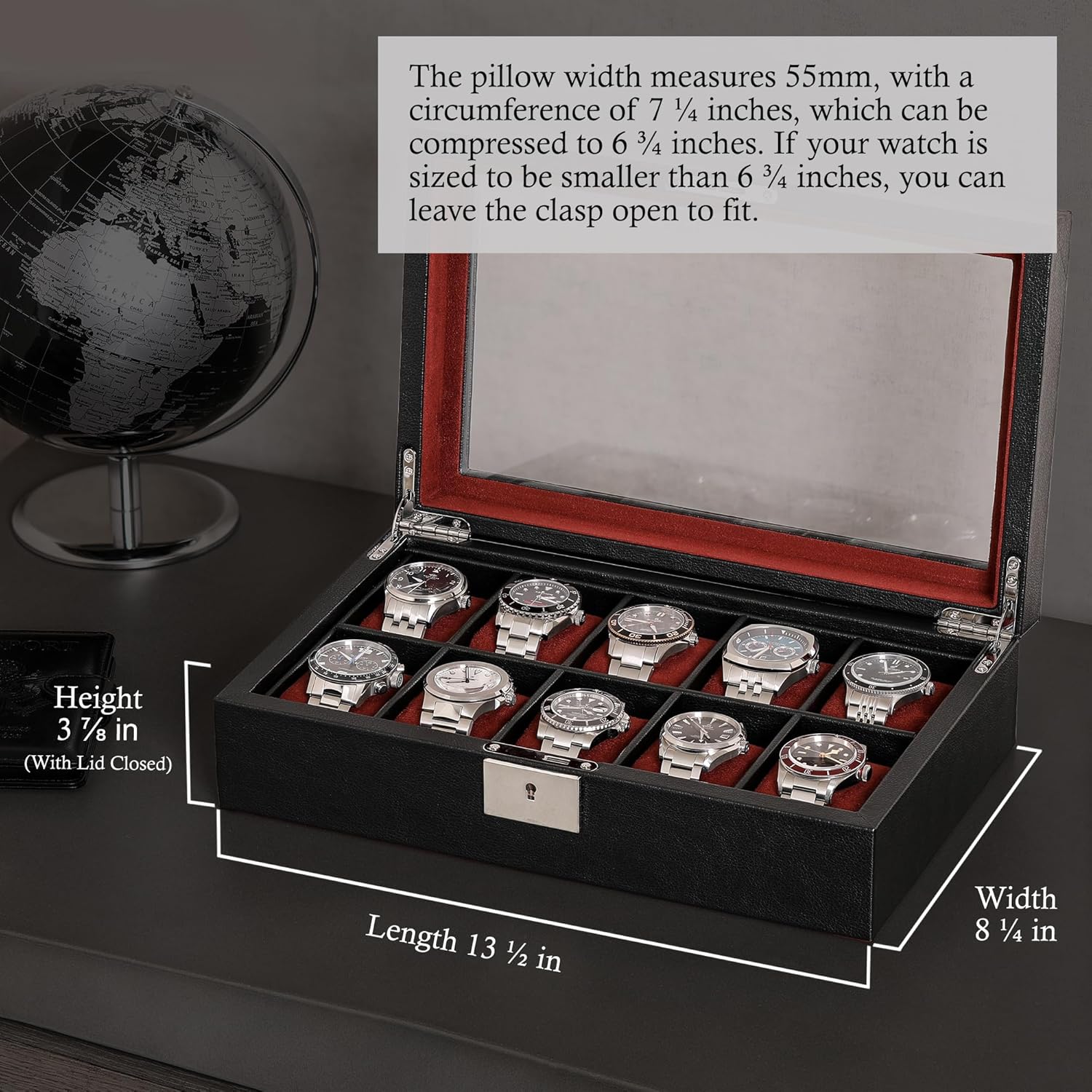 - 10 GROSSE UHRENFÄCHER: Jedes Kissen hält eine kleine oder grosse Uhr ordentlich an Ort und Stelle, bis zu 60 mm nebeneinander. Zwischen Deckel und Kissen ist viel Platz für Uhren aller Grössen.