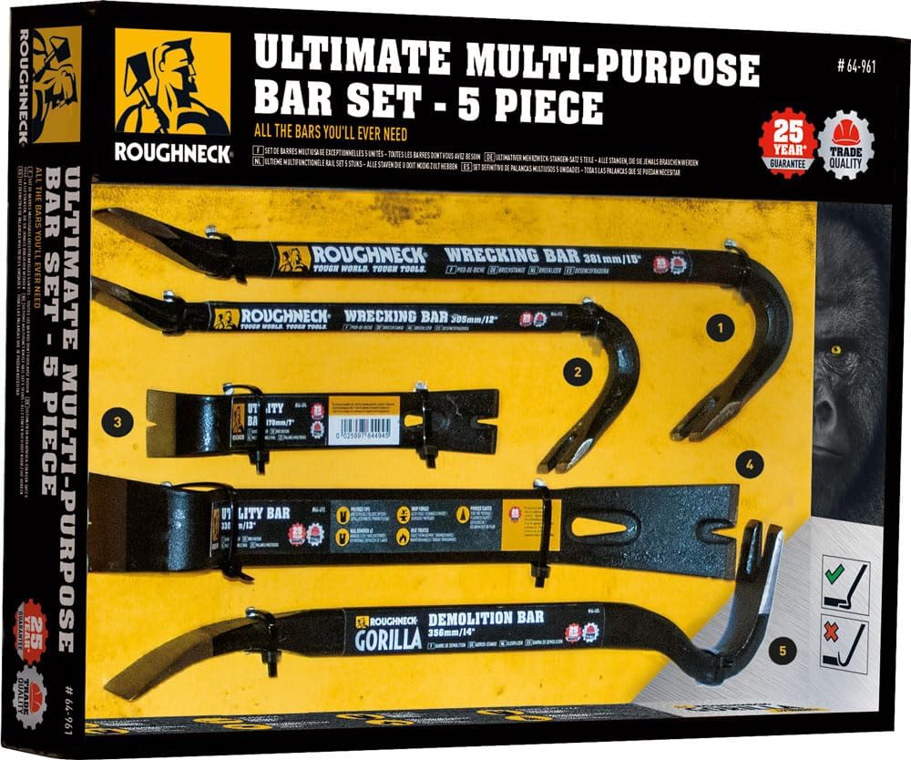 - Lieferumfang: Roughneck Gorilla Bar 13', Brechstange 330 mm (64-493), Roughneck Gorilla Bar 14', Brechstange 356 mm (64-405), Roughneck Gorilla Bar 15', Brechstange 381 mm (64-415), Roughneck Brecheisen 7', Nageleisen 178 mm (64-494), Roughneck