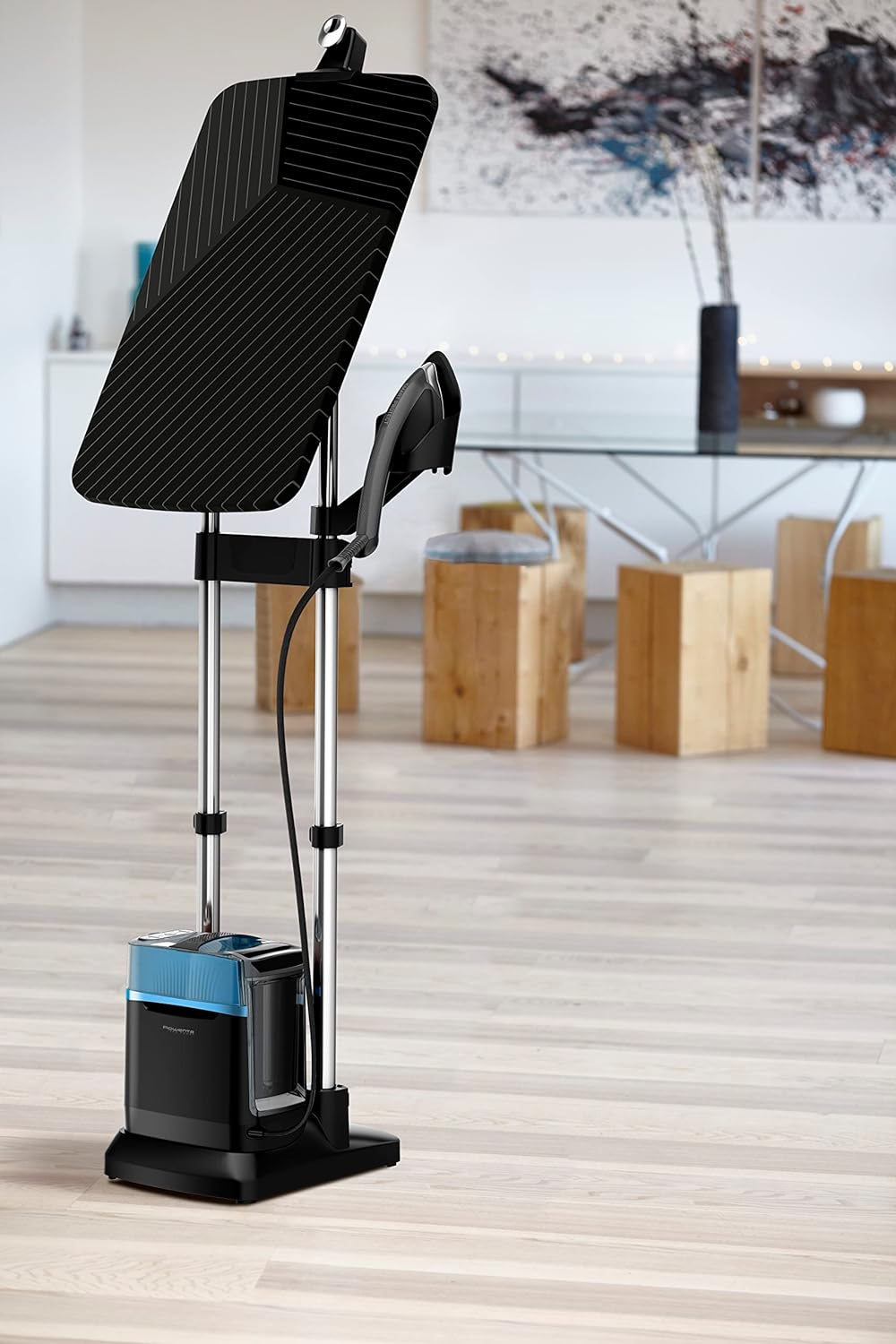 - Innovatives Bügelbrett mit 3 Positionen: geneigt, ermöglicht ein bequemes Bügeln; vertikal, ideal für Jacken und Kleider; horizontal