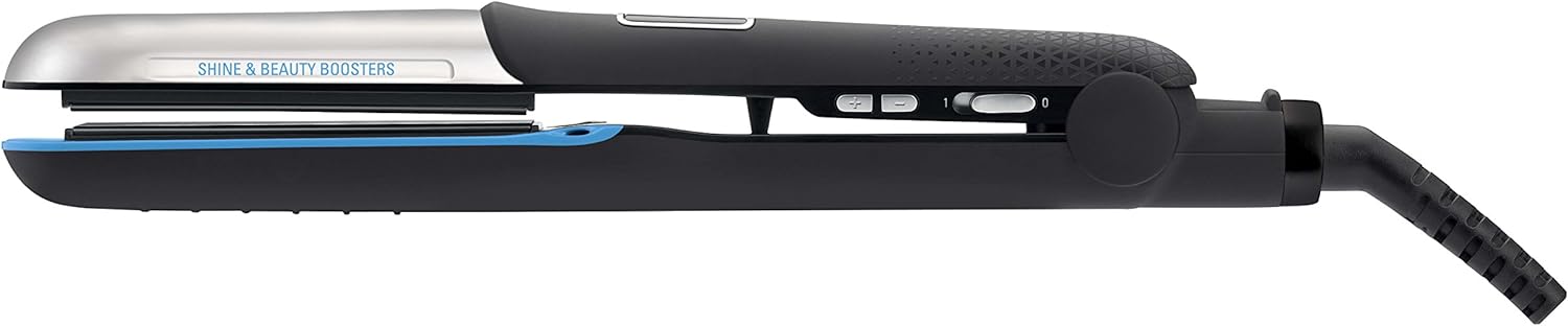 • Der Ionen Generator und die hochwertigen Nano-Keramik Styling Glättplatten sorgen dabei für ein schonendes Styling und glamourös glänzendes Haar. Federnd gelagerte Glättplatten (Abmessung 2,5 x 9 cm) sorgen für optimalen Kontakt zum Haar.