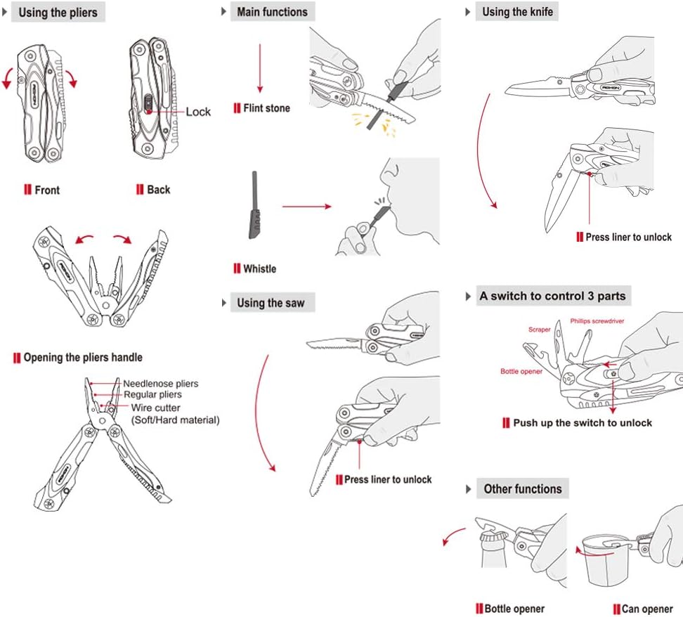 • Schliessmechanismus: Unabhängiger Verriegelungsmechanismus, alle Werkzeuge lassen sich gut einrasten. 14 Funktionen in 1, inklusive Säge, Messer, Dosenöffner, Flaschenöffner, Flachschraubendreher, Kreuzschlitzschraubendreher, Nadelzange, normale