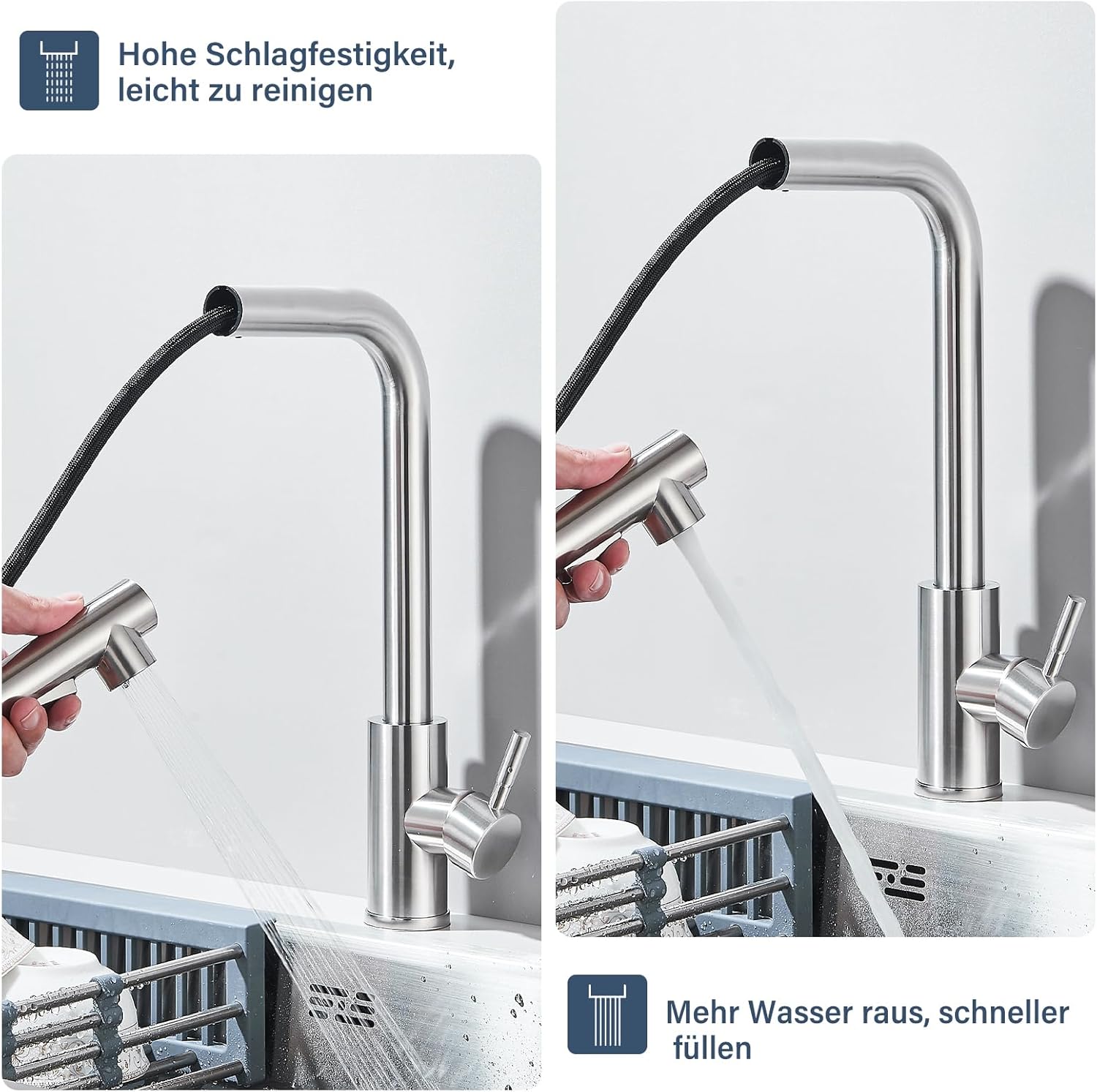 - SCHÖNES DESIGN: 360° schwenkbarer Küchenarmatur aus Gebürstetes Nickel Edelstahl mit ausziehbarer Brause für maximale Flexibilität bei der Küchenarbeit