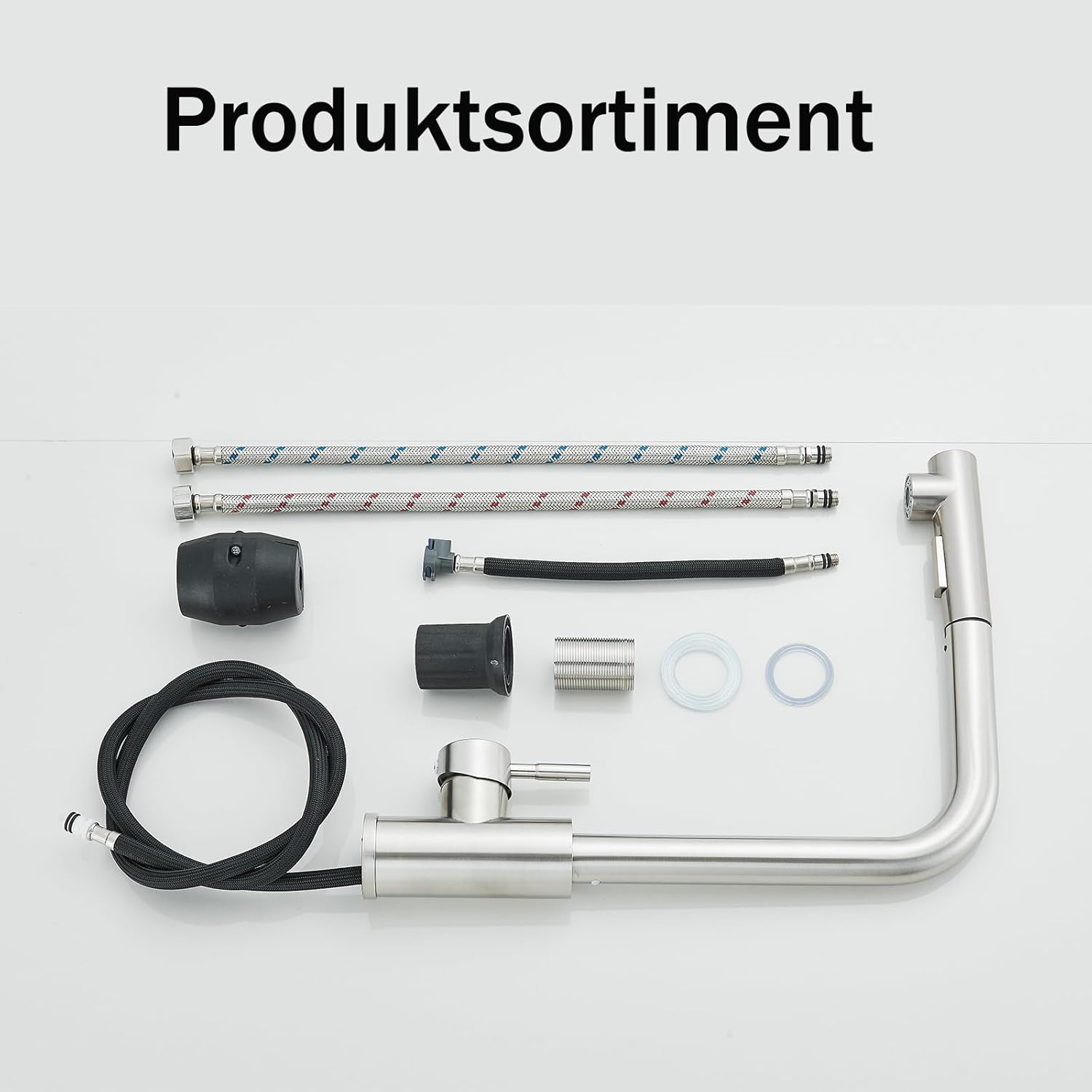 - INSTALLATION: Komplettes Montageset mit flexiblen Anschlussschläuchen und allen erforderlichen Befestigungsteilen enthalten.Das benötigte Zubehör ist vollständig enthalten, mit wenigen Handgriffen kann man selbst die Spülen Armatur installieren.