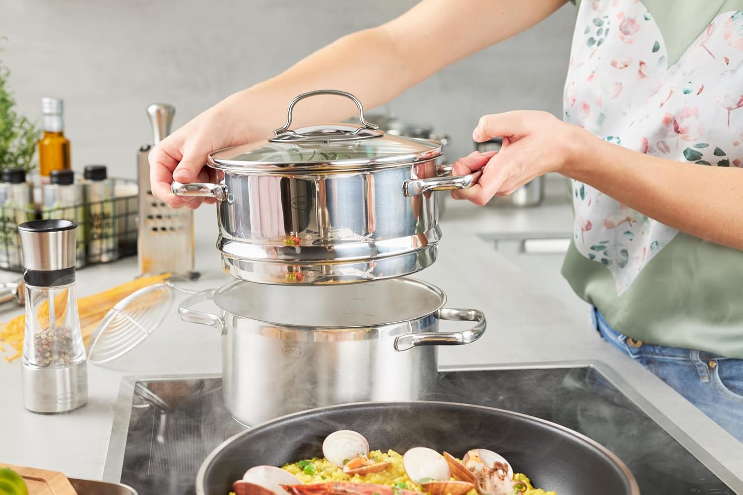 - Praktischer rundumlaufender Schüttrand zum tropffreien Ausgiessen; Dämpfeinsatz auch als Abtropfsieb nutzbar;