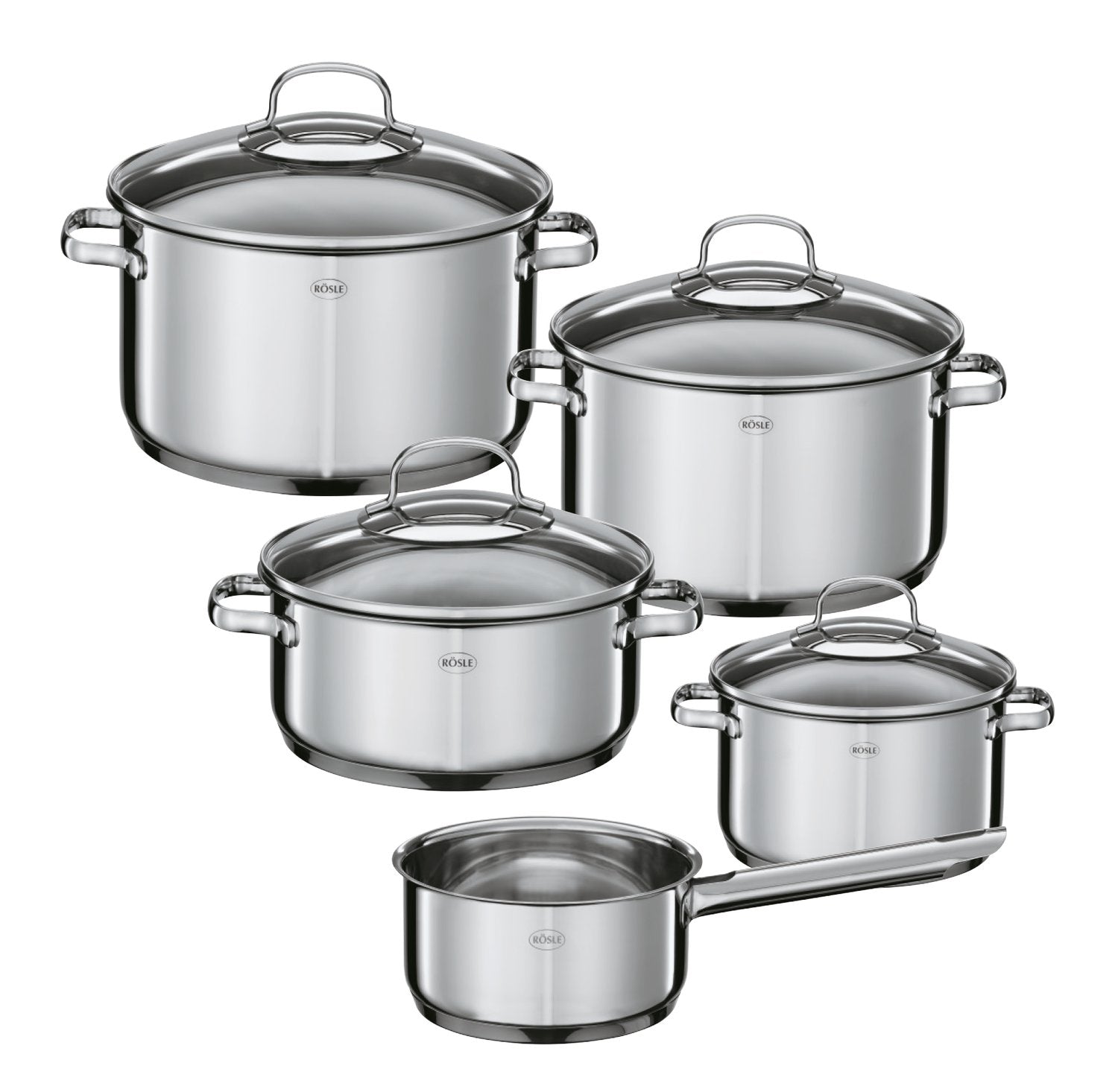 RÖSLE ELEGANCE Topfset, 5-tlg., Edelstahl 18/10, 2-ton-poliert, mit Glasdeckel, Bratentopf, Kochtopf