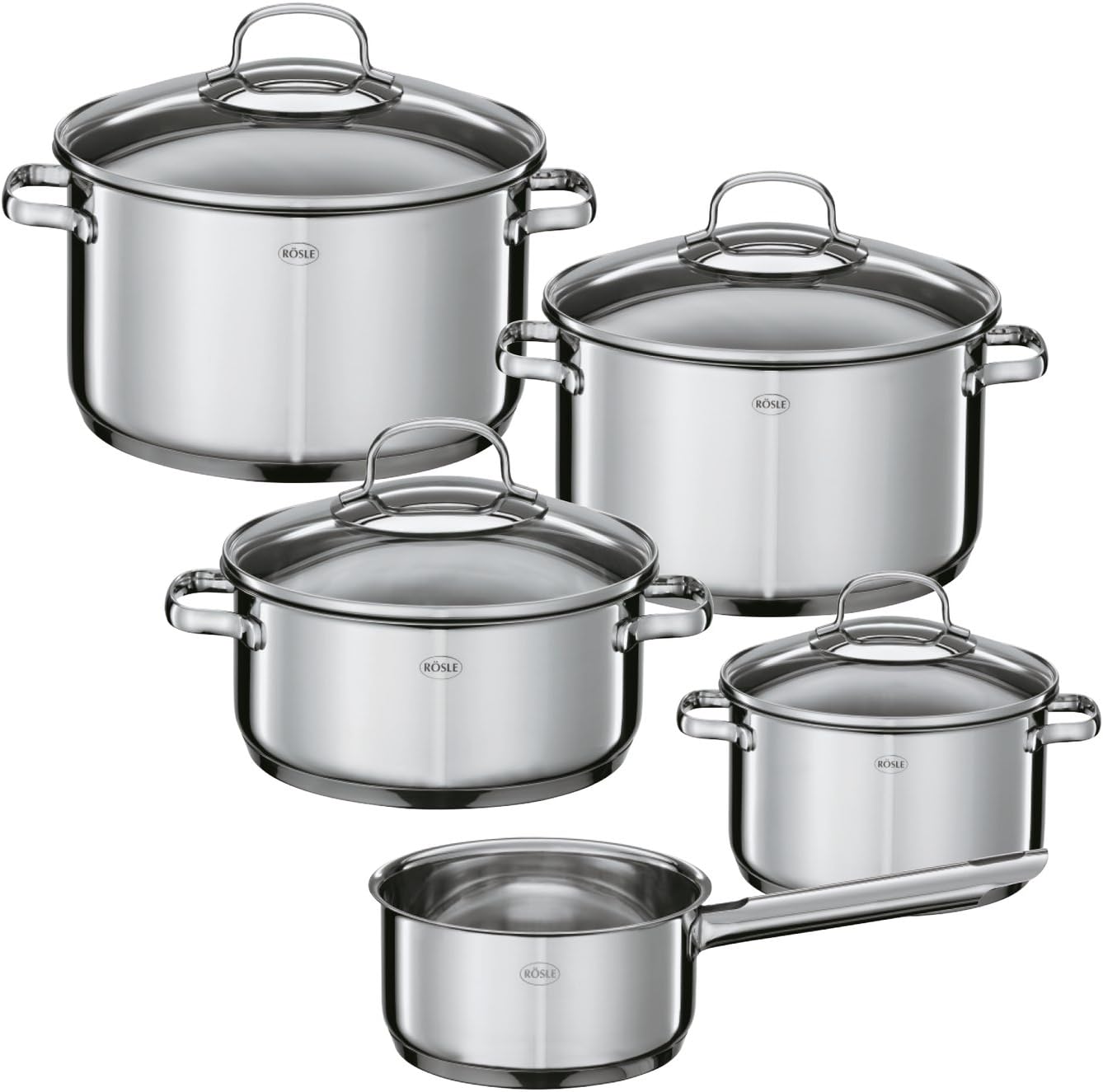- RÖSLE ELEGANCE: Das Topf-Set aus Edelstahl umfasst 3 Kochtöpfe (Ø 16, 20 und 24 cm) und 1 Bratentopf (Ø 20 cm) inklusive Glasdeckel sowie eine Stielkasserolle (Ø 16 cm)