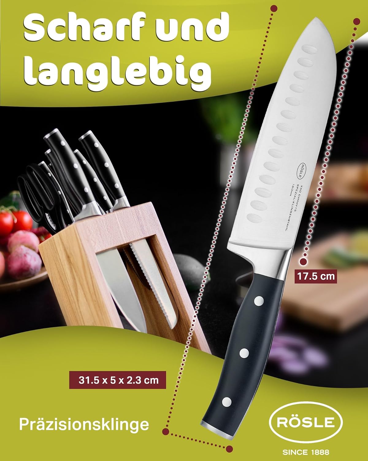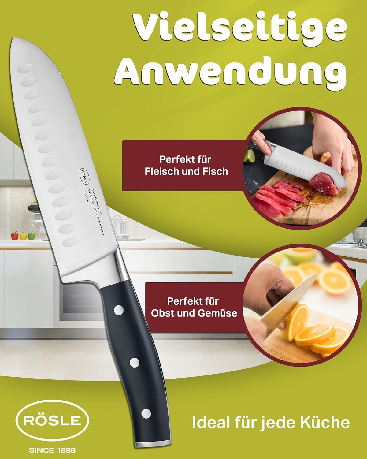 RÖSLE Santokumesser Tradition, Hochwertiges Küchenmesser mit Kullenschliff zum feinen Schneiden von