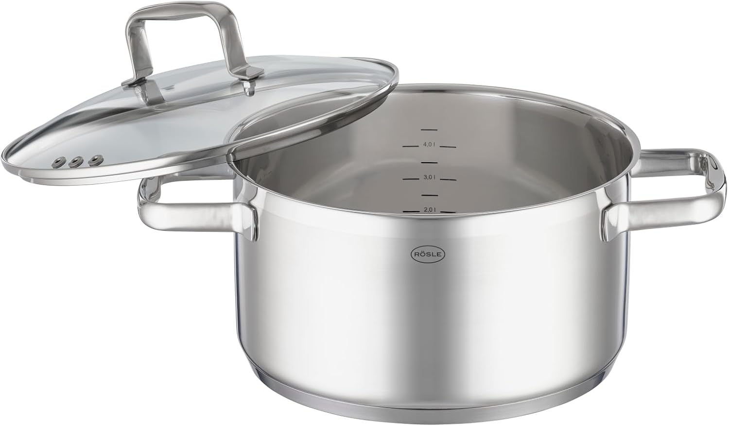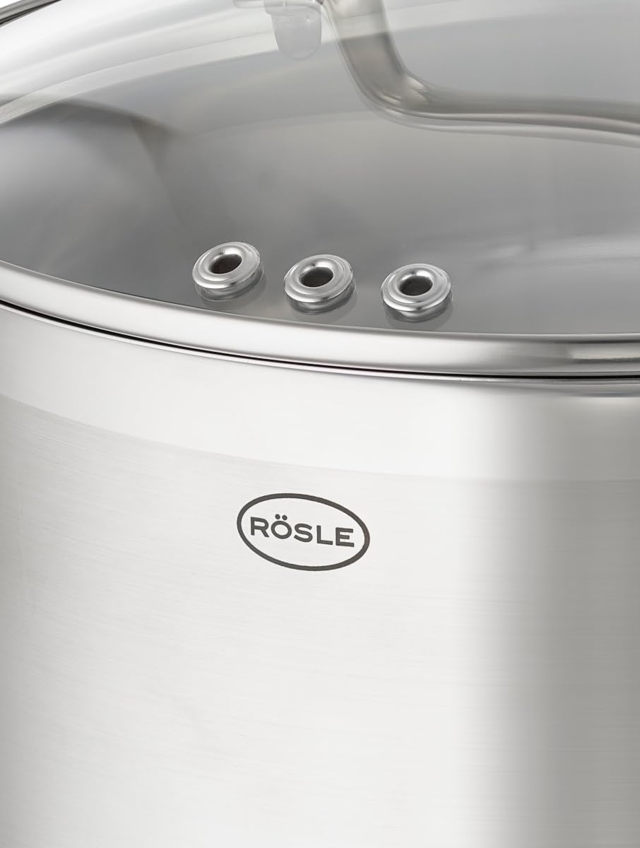 RÖSLE CHARM Kochtopf, Hochwertiger Universaltopf aus Edelstahl 18/10, 24 cm, Glasdeckel, Innenskalie