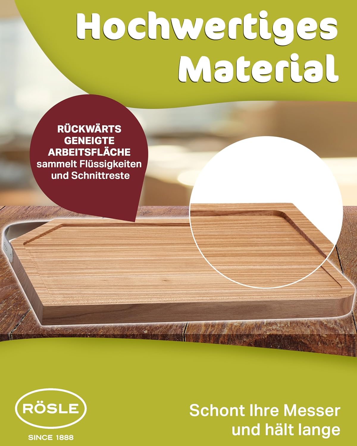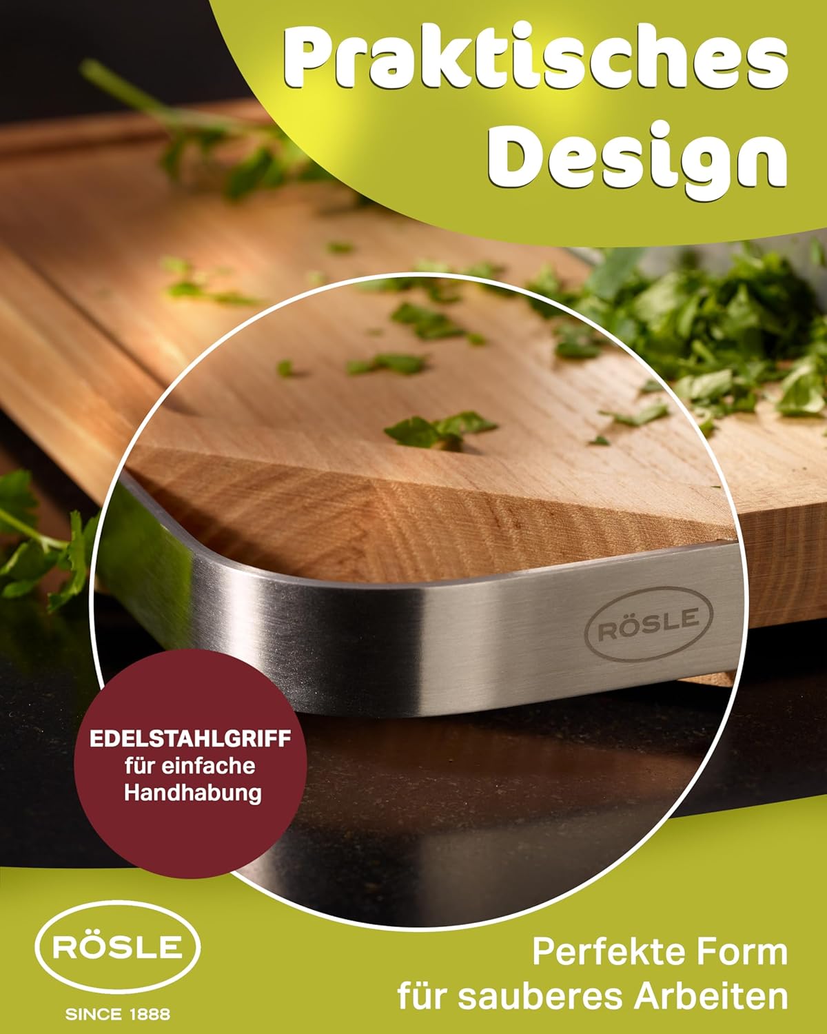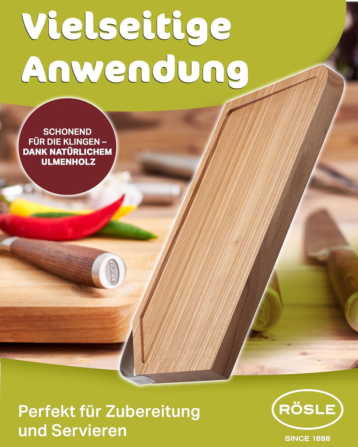 - RÖSLE Schneidbrett mit Edelstahlgriff: Praktisches Schneidebrett aus hochwertigem Ulmenholz - findet seinen Einsatz gleichermassen beim Zubereiten von Speisen als auch beim Servieren am Tisch - ein unverzichtbares Küchenutensil für jede Küche,