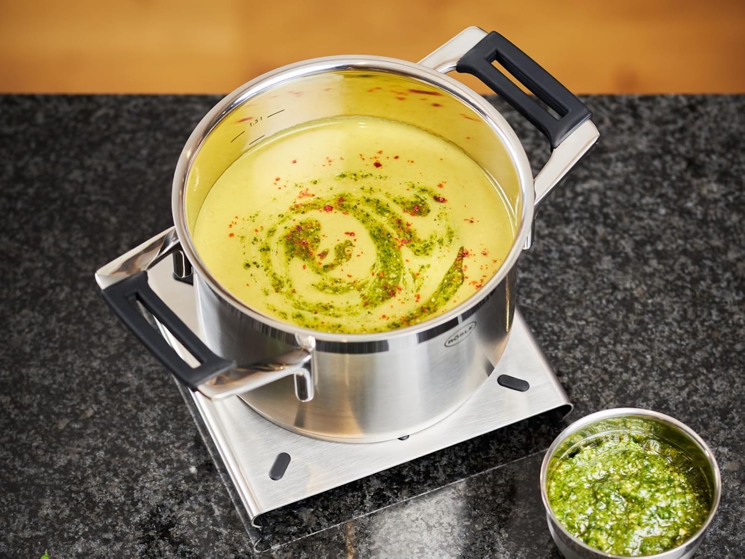 • Praktisch: Mit Innenskalierung kann auf das Abmessen von Wasser oder Milch mit einem Messbecher verzichtet werden - Glasdeckel mit Einsicht in das Topfinnere und rundumlaufendem Silikonabschluss für eine exakte, dichte Auflage auf den Kochtöpfen - aus