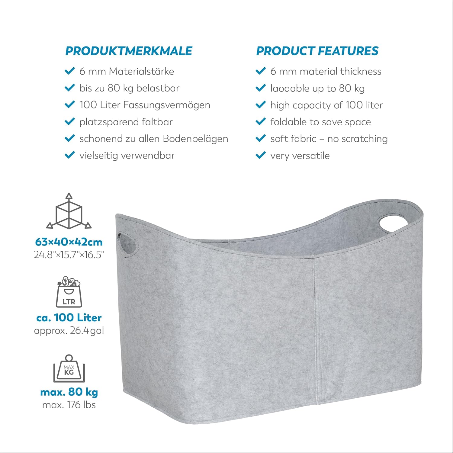 - Mit 6mm Materialstärke, den sauberen Lasercut-Kanten mit stylish stabilen Nähten und 2 praktischen Henkeln können Sie bis zu 80kg tragen. Dabei ist der Filzkorb durch das geringe Eigengewicht auch sehr leicht zu transportieren
