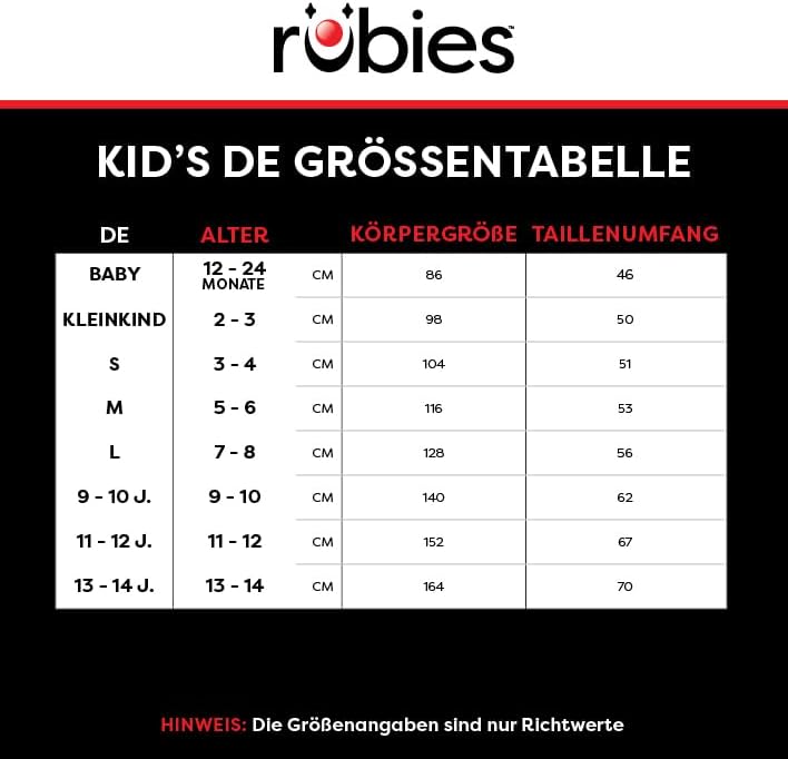 - Kostüm erhältlich in den Kindergrössen S 3 - 4 Jahre, M 5 - 6 Jahre, L 7 - 8 Jahre, Alter 9 - 10, 11 -12 und 13 - 14 Jahre