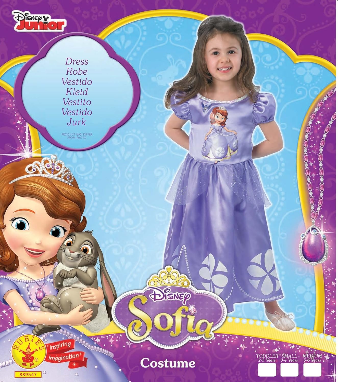 - Prinzessinnenkleid aus lila Glanzstoff mit Puffärmeln, Rock mit weissen Ornamenten, Unterrock und einem Schösschen aus Glitzertüll. Das Kleid ist mit einem grossen Bild von Sofia verziert und hat einen silbernen Kragen.