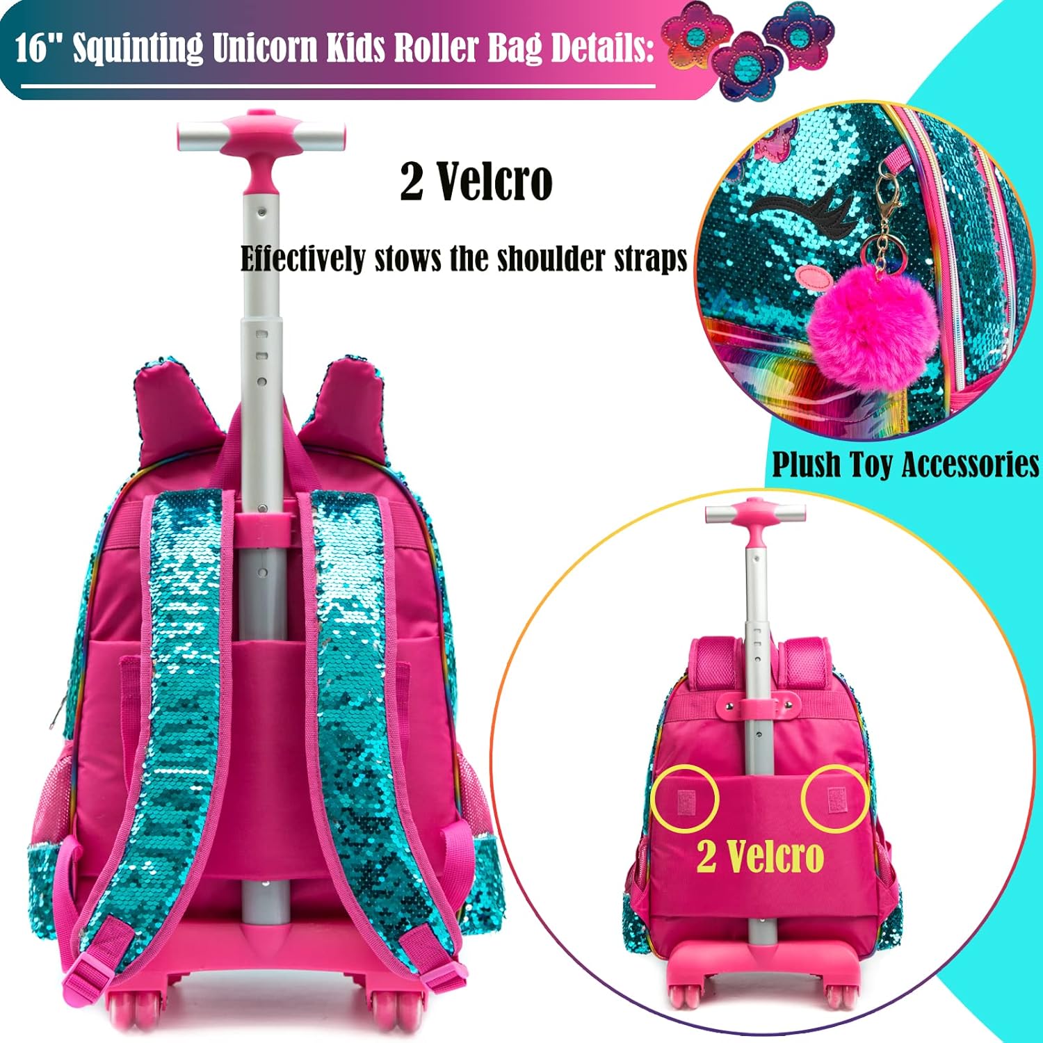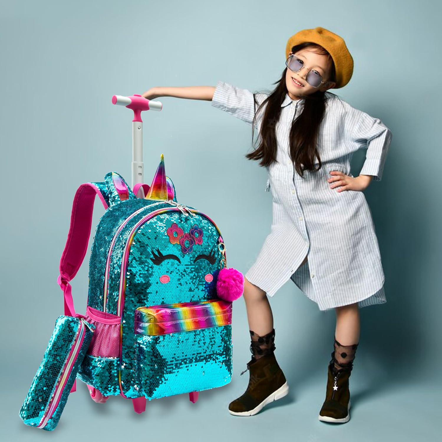 - 🎄【Rollender Schulrucksack für Kinder】 3PCS 16”Mädchen grüner Einhorn-Pailletten-Trolley-Rucksack : - 1 PCS Trolley-Rucksack (H: 42 cm x L: 30 cm x B: 16 cm) - 1 PCS Mäppchen (L: 23CM) - 1 PCS Lunchpaket (H: 23 cm x L: 20cm x B: 10cm)