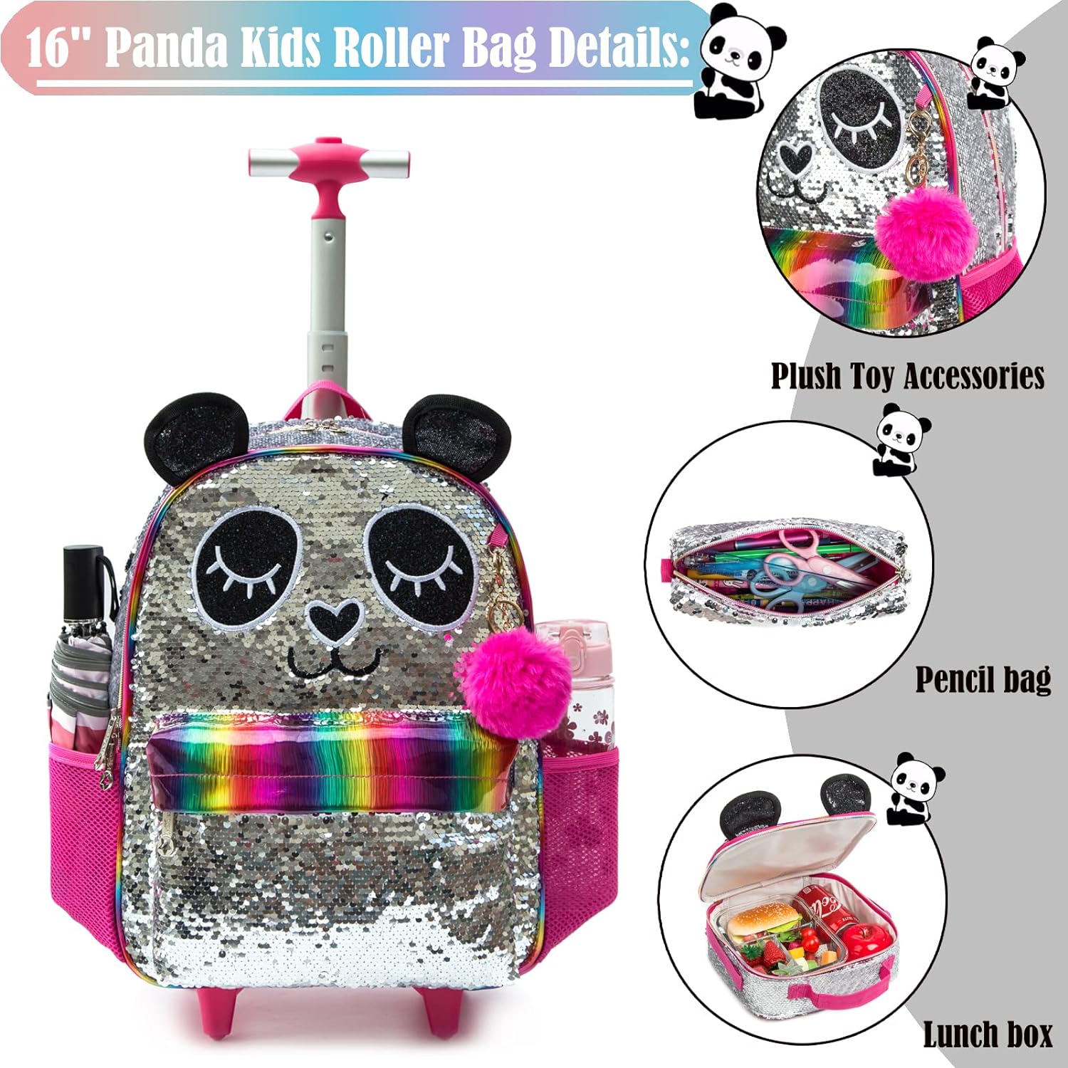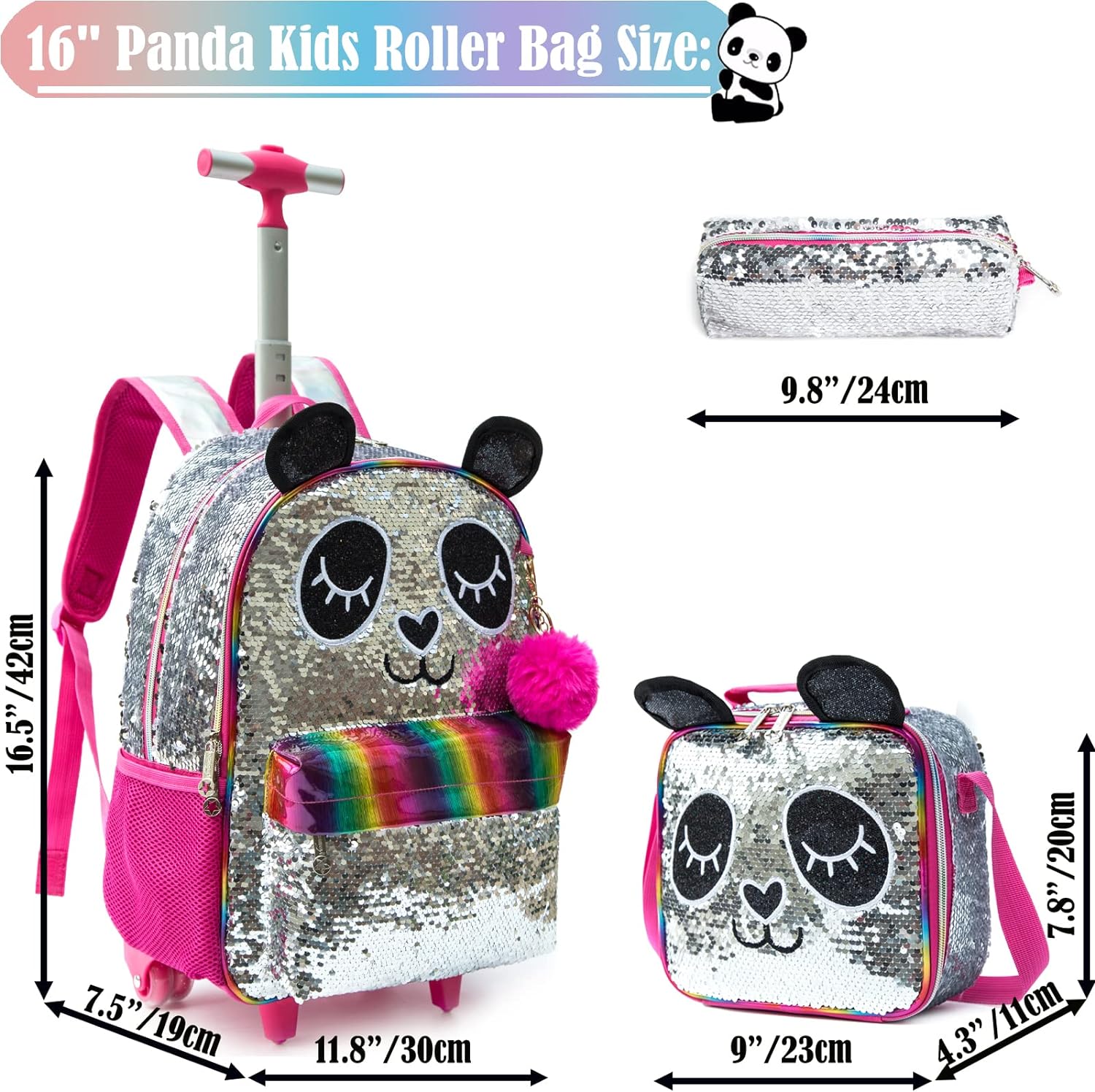 • 🎄【Rollender Schulrucksack fĂŒr Kinder】 3PCS 16”MĂ€dchen Silber Rot Panda-Pailletten-Trolley-Rucksack : - 1 PCS Trolley-Rucksack (H: 42 cm x L: 30 cm x B: 16 cm) - 1 PCS MĂ€ppchen (L: 23CM) - 1 PCS Lunchpaket (H: 23 cm x L: 20cm x B: 10cm)"