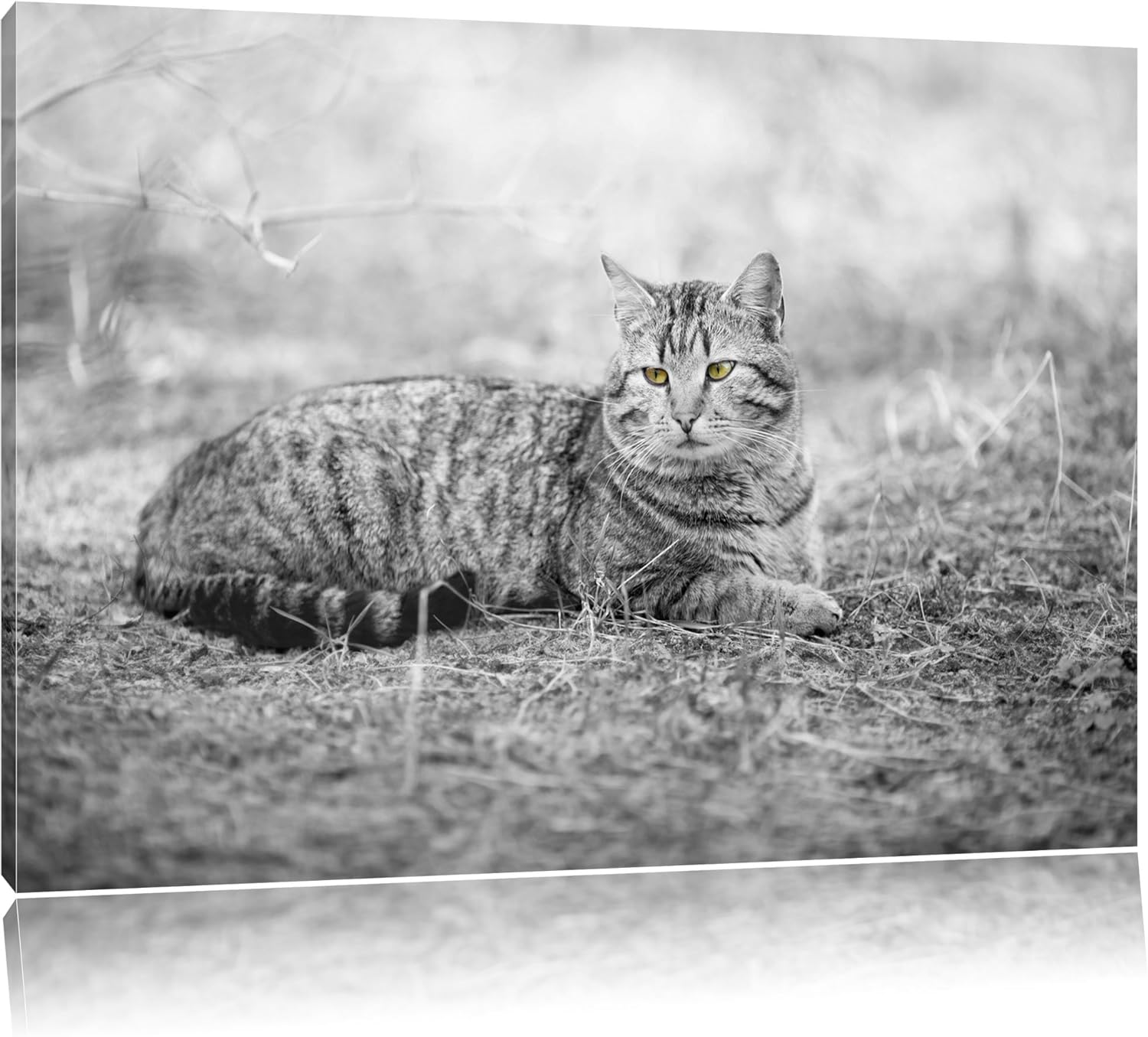 ruhende Katze auf Waldboden schwarz/weiss Format: 100x70 auf Leinwand, XXL riesige Bilder fertig ger