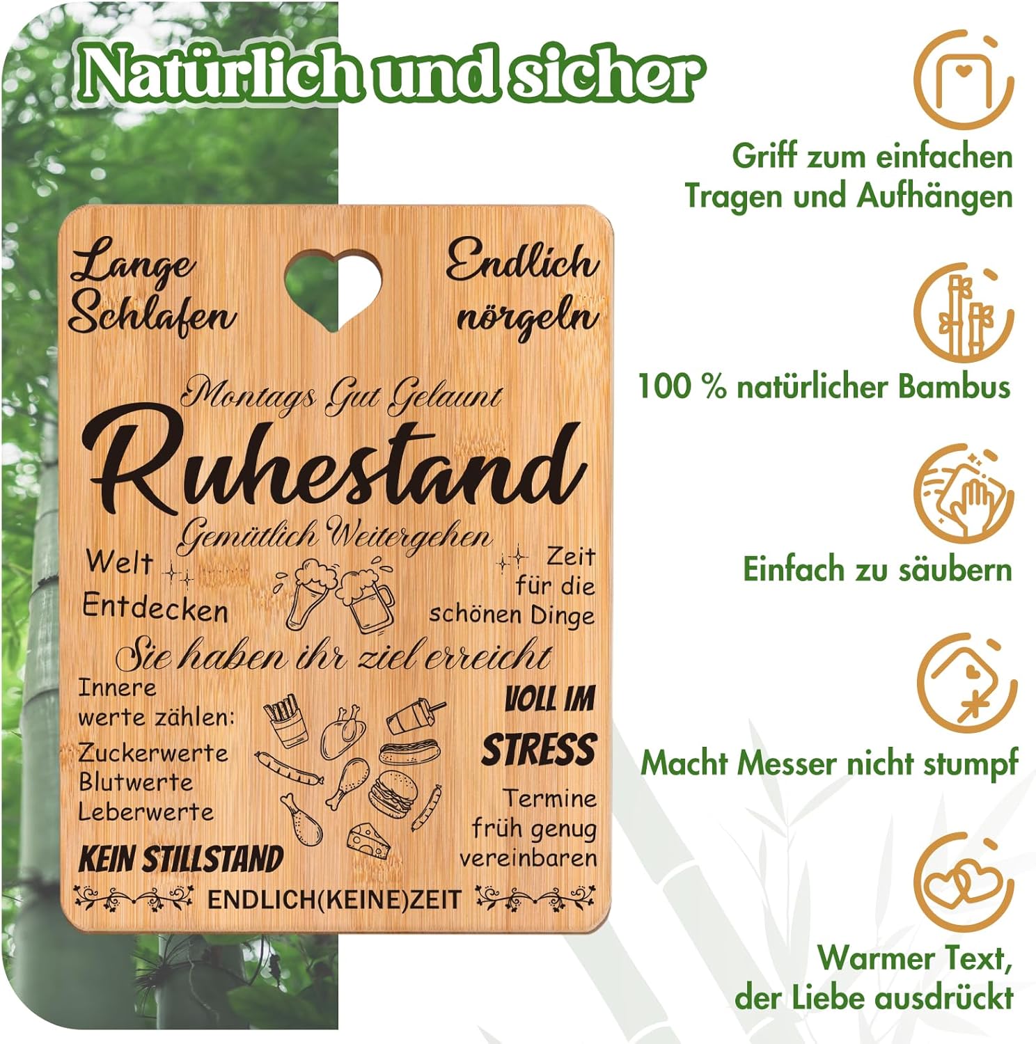 - đ [Praktisch und Schön] - Dieses Ruhestand Geschenk ist praktisch und schön, mit einem Tragegriff, leicht zu holen und hĂ€ngen. Das exquisite Bambus-Schneidebrett kann nicht nur zum Schneiden von GemĂŒse und Obst verwendet werden, es ist auch die