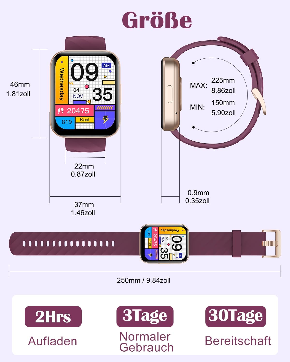 - 【24-Stunden-Herzfrequenz-, Schlaf- und SpO2-Überwachung】 Die Smartwatch kann Ihre Herzfrequenz alle 5 Minuten automatisch in Echtzeit überwachen und Ihre SpO2-Sättigung manuell ermitteln. Ihr Schlaf kann auch automatisch über die Smartwatch und